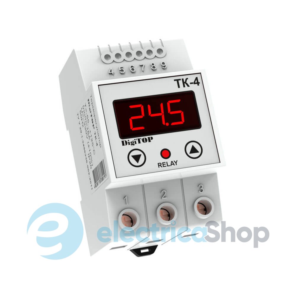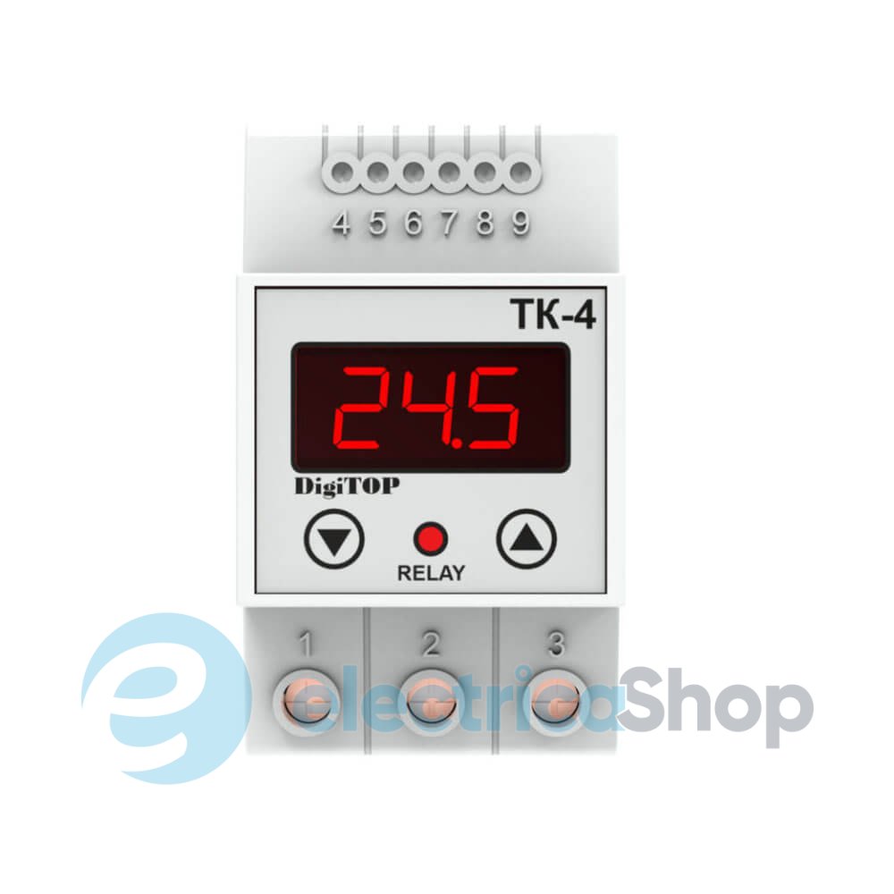 Терморегулятор DigiTOP ТК-4 призначений для контролю та підтримки діапазону температур у житлових та комерційних приміщеннях. Поточне значення температури відображається на світлодіодному індикаторі та підсвічується червоним кольором.