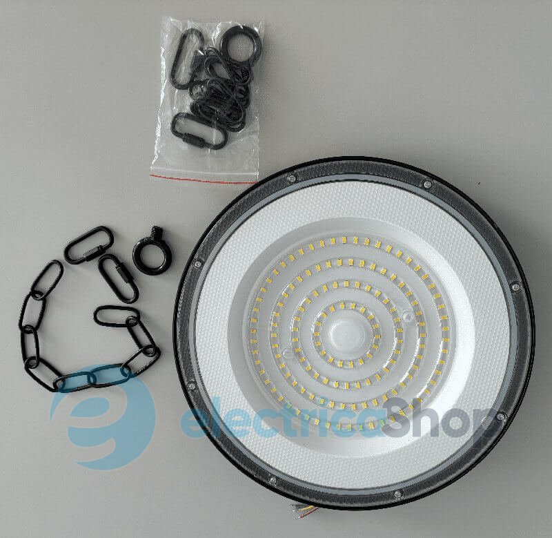 Герметичний світлодіодний світильник ELMAR LHB.100.6500 100W 11000Lm призначений для високих стель промислових приміщень. Модель ідеально підходить для складських приміщень, логістичних залів, торгових центрів. Працюють дані світильники у широкому діапазоні вхідної напруги – від 100 до 265V. Матеріал корпусу алюміній та високий рівень пиловологозахисту IP65 дозволяють використовувати їх у приміщеннях з низькими температурами, підвищеною вологістю тощо. Робочі температури від -30 до +35 °С. В комплекті до кожного світильника йде кільце для підвісу, ланцюжок завдовжки 30 см та 2 карабіни. Кріплення на скобу не передбачено.