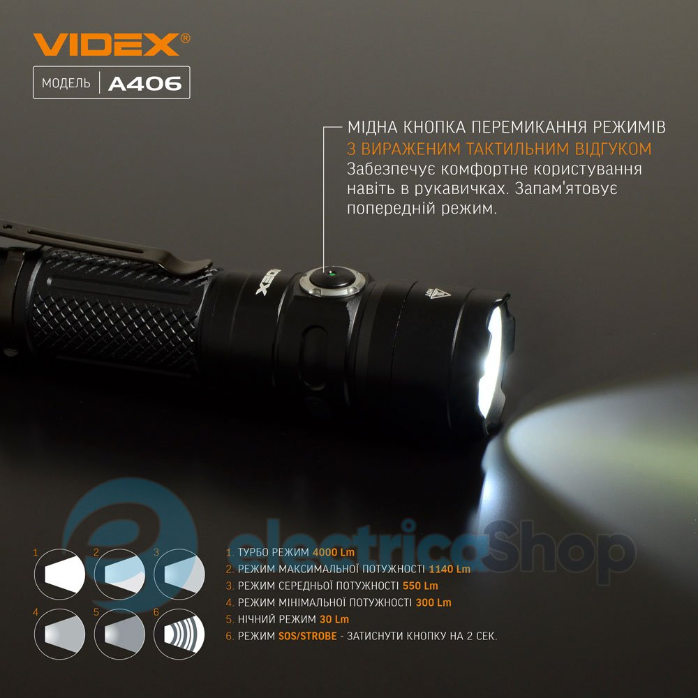 Портативний світлодіодний ліхтарик VIDEX 4000Lm 6500K призначений для індивідуального використання в темний час доби або в приміщеннях без освітлення. Основними показниками є герметичність, надійний корпус, дальність світла. Дозволяє обрати необхідний режим роботи.