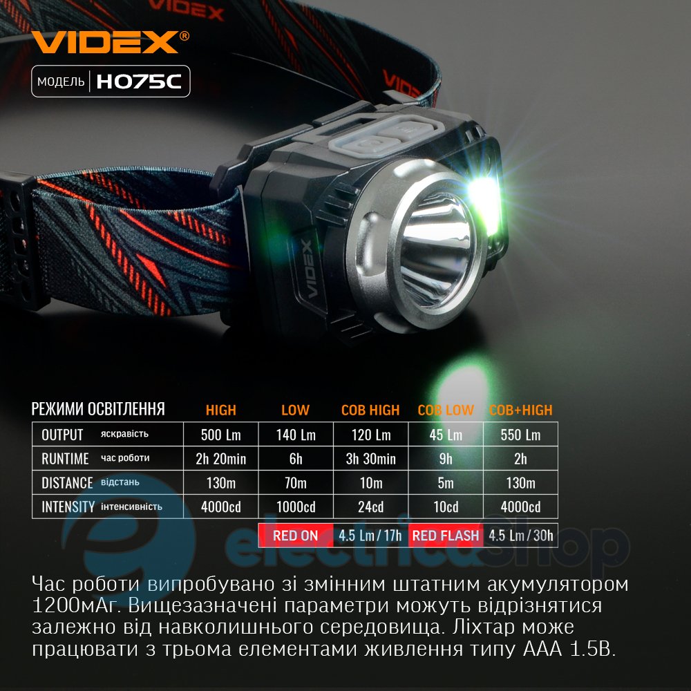 COB+HIGH (основне та ближнє світло максимальної потужності) - яскравість світла 550Lm. Дистанція освітлення налічує 130м. Тривалість роботи 2год. Інтенсивність світлового потоку 4000cd.
