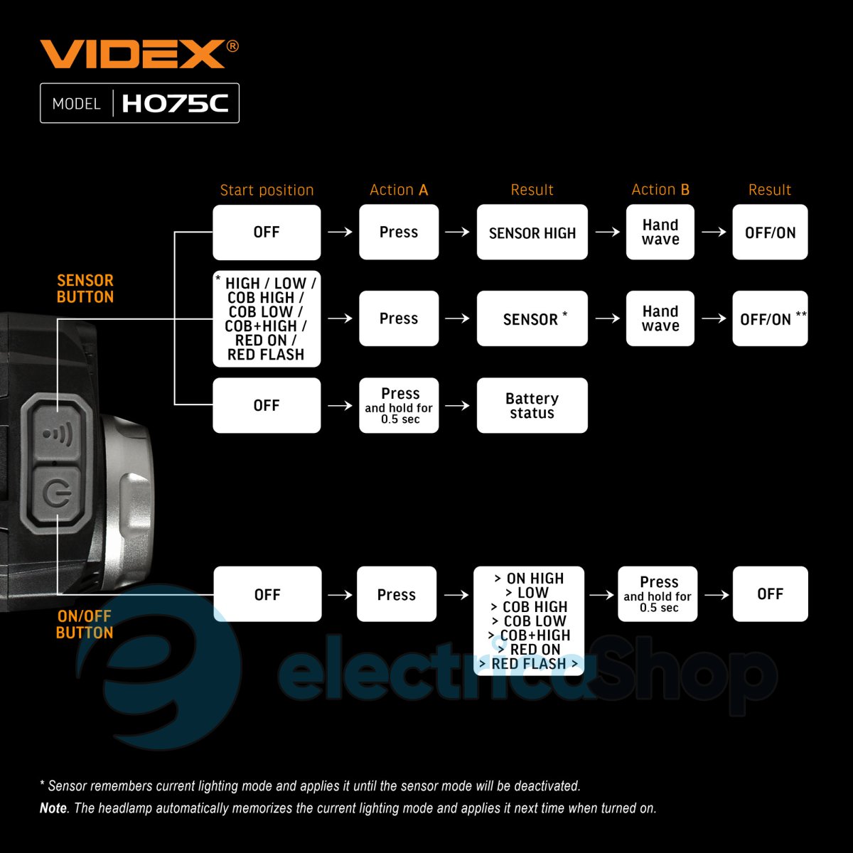 Кнопка сенсора допомагає увімкнути ліхтар та контролювати його режими жестами рук. Тривале натискання кнопки сенсора відображає заряд ліхтаря. Короткочасне натискання функціональної кнопки дозволяє перемикати режими роботи.