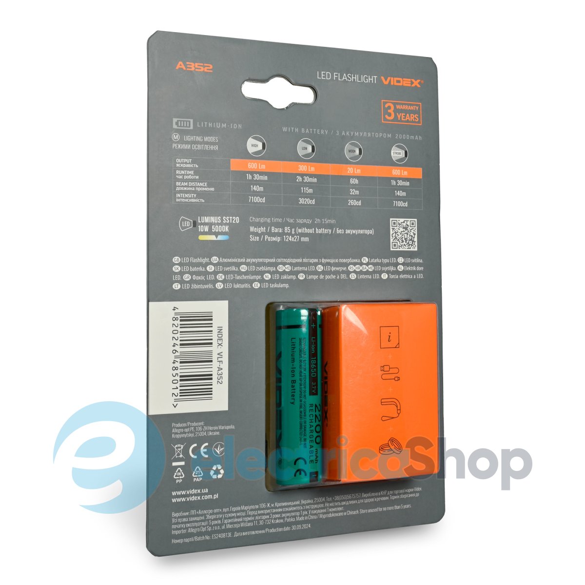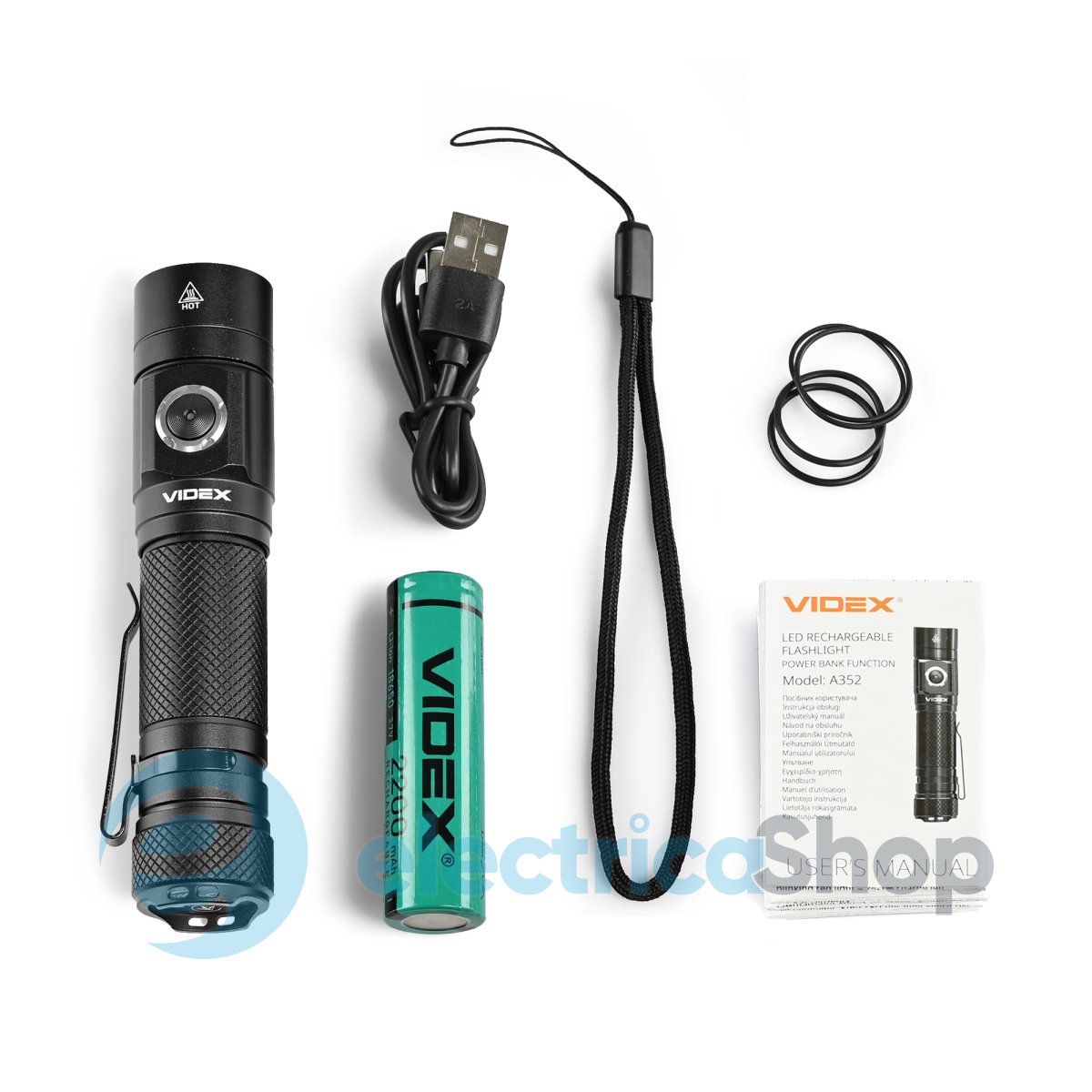 Портативний світлодіодний ліхтарик VIDEX VLF-A352 600Lm 5000K призначений для індивідуального використання в темний час доби або в приміщеннях без освітлення. Основними показниками є герметичність, надійний корпус, дальність світла. Дозволяє обрати необхідний режим роботи. Використовується шнур для ліхтаря, що забезпечує зручне користування і транспортування. В комплект також йде кліпса, за допомогою якої ліхтарик можна носити на рюкзаку, ремені, бейсболці та інших місцях, де це можливо. Особливістю даної моделі є наявність виходу USB-A (5В, 1А) на корпусі ліхтаря для підзарядки телефону та інших гаджетів в екстрених випадках за потреби.
