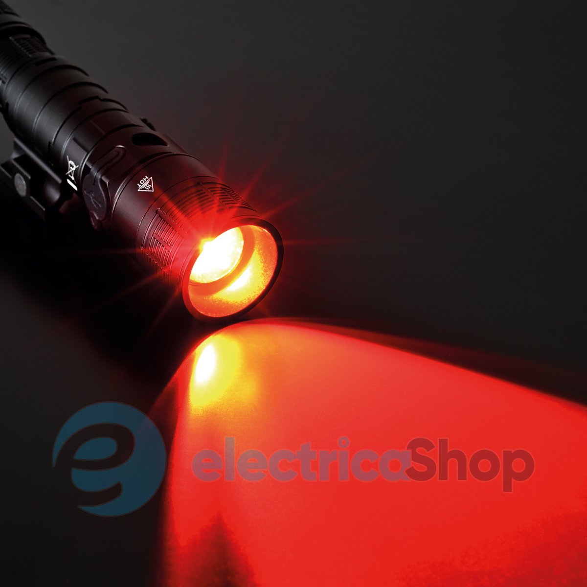 RED LOW (Червоне світло мінімальної потужності) – яскравість світла 5Lm. Дистанція освітлення налічує 15м. Тривалість роботи 120год. Інтенсивність світлового потоку 43cd.