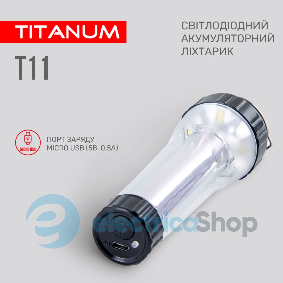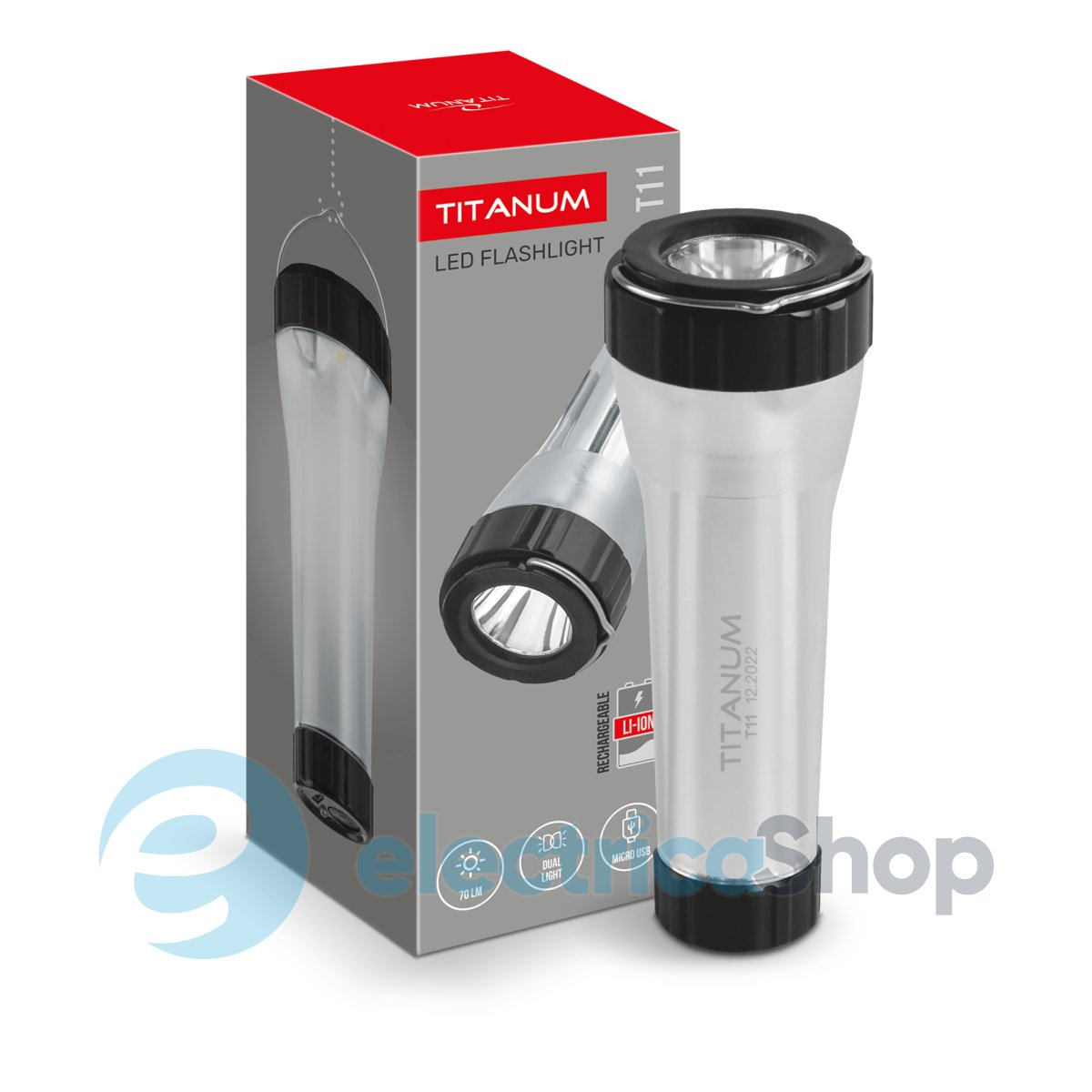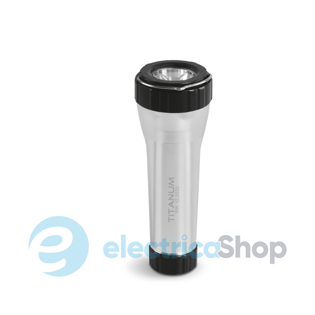 Портативний світлодіодний ліхтарик TITANUM TLF-T11 з акумулятором призначений для використання у темну пору доби або в приміщеннях без освітлення. Має компактні розміри, зручну ергономічну форму та працює від акумулятора. Особливістю даної моделі є два джерела світла: переднє (основне) та нижнє, яке використовують переважно для ближнього освітлення. Підходить для застосування у побуті, має полу кільце на корпусі завдяки якому дуже зручно використовувати в підвісному стані.