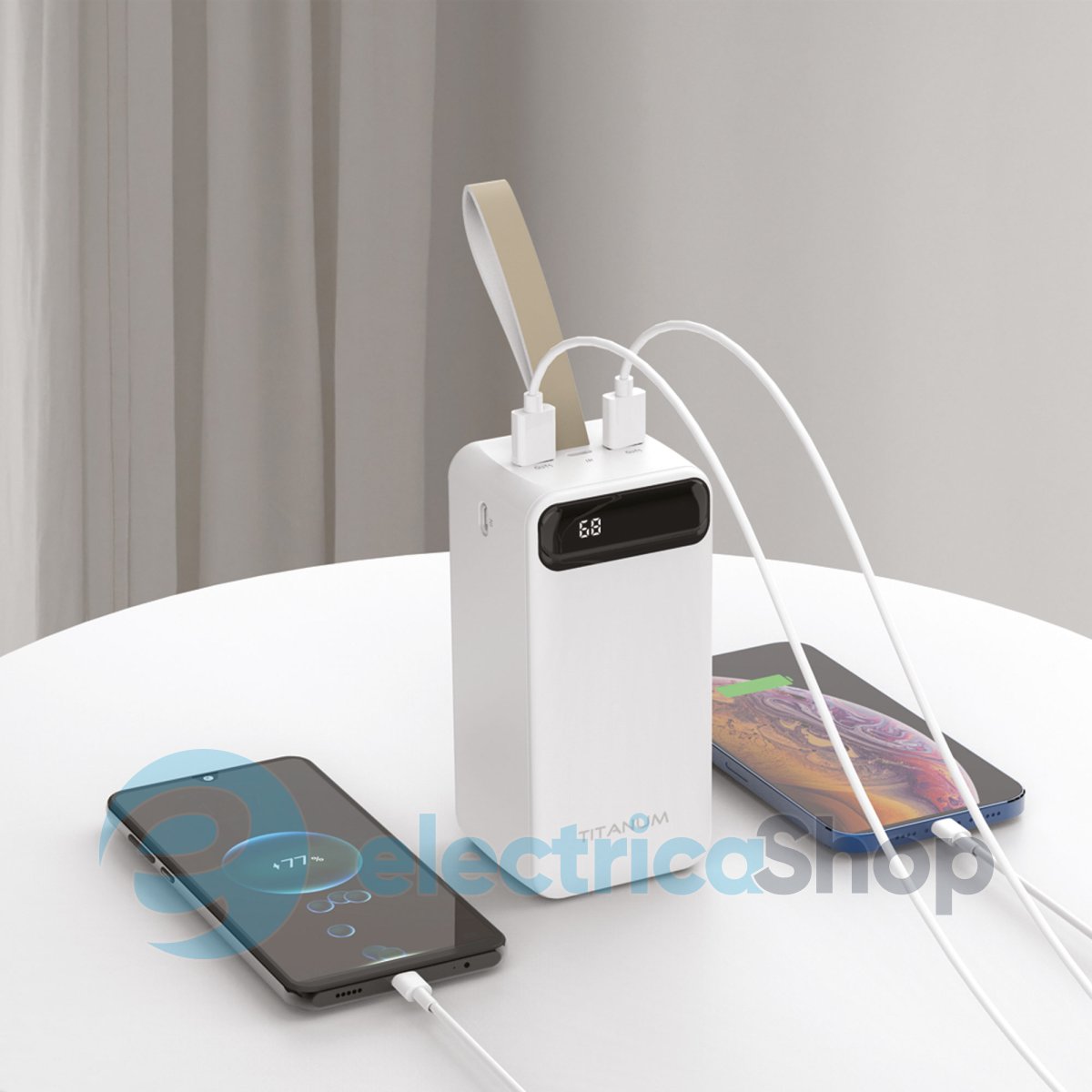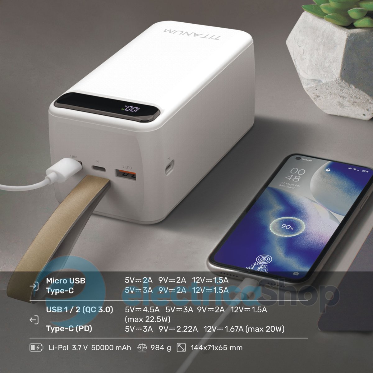 Повербанк 50000mAh TITANUM 741S 22.5W White (TPB-741S-W) призначений для зарядки планшетів, смартфонів, мобільних телефонів та інших пристроїв та гаджетів. Він дозволяє підтримувати улюблені гаджети в робочому стані тривалий час в поході, подорожі, поїздці чи в разі відсутності електроенергії. Корпус виготовлений з АБС пластику, властивості якого забезпечують стійкість повербанка до високих температур і захист його внутрішніх компонентів від механічних пошкоджень. Має вбудований LED-ліхтар, який стане в пригоді у разі потреби додаткової підсвітки, та дисплей, який відображає рівень заряду батареї. Оснащений ручкою, яка полегшує процес транспортування виробу. В комплект разом із повербанком входить кабель USB-C для його заряджання.