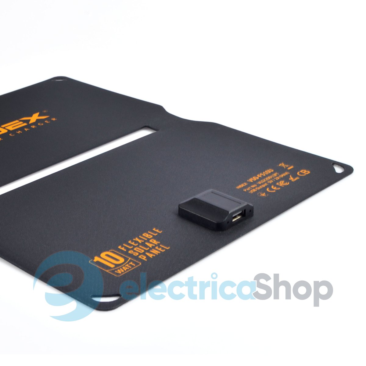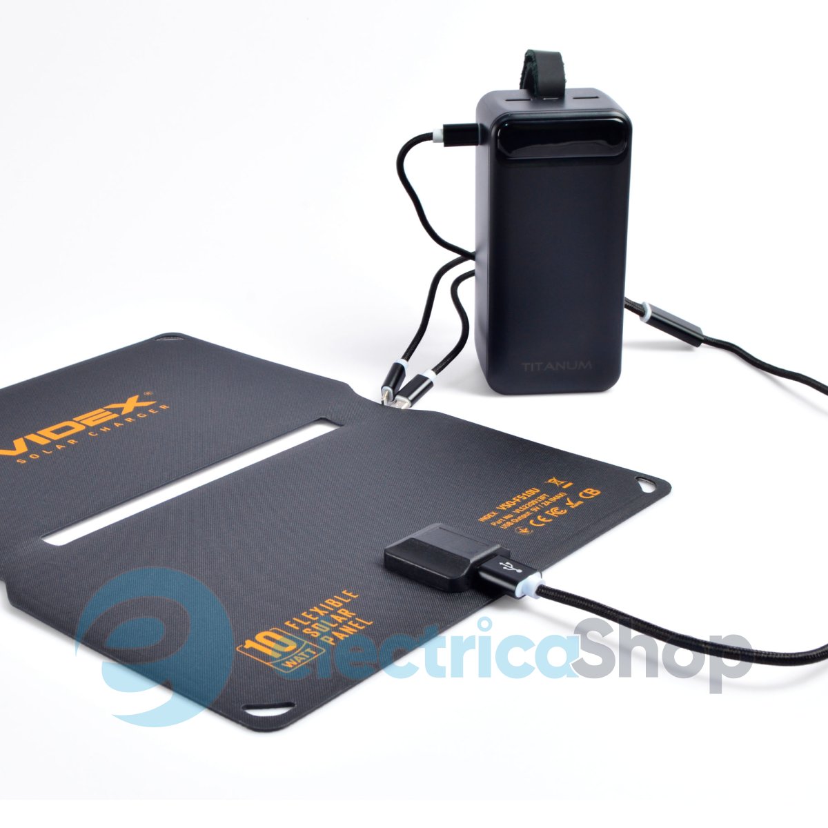 Портативний сонячний зарядний пристрій VIDEX F510U 10W, який може перетворювати сонячне світло на електрику для негайного виробництва відновлюваної енергії. Він може заряджати різноманітні пристрої, такі як мобільний телефон, планшет, павербанк тощо.