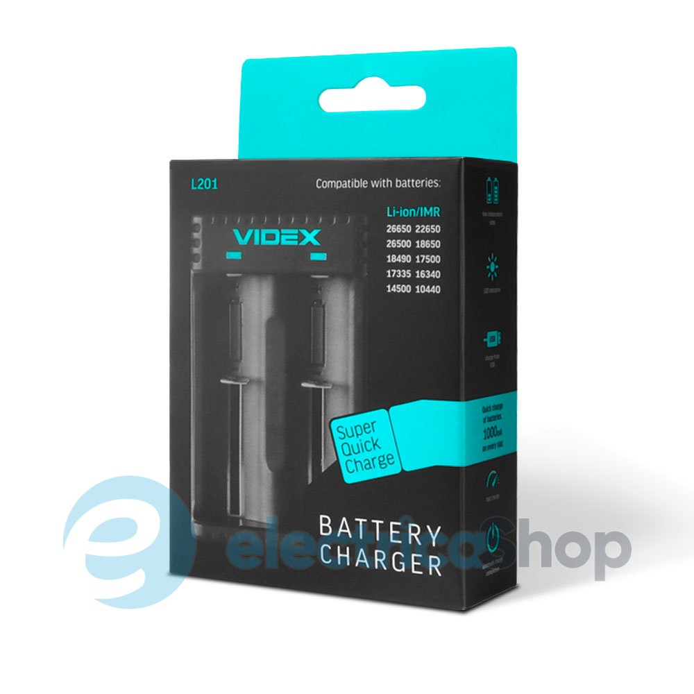 Зарядний пристрій Videx VCH-L201 - призначений для багаторазового заряду акумуляторних елементів живлення. В тому числі і літій-іонних акумуляторів. Зарядний пристрій має два незалежних канали. Струм заряду визначається автоматично. Пристрій оснащено LED індикацією та індикацією невірної полярності. Струм заряду 1000мА, напруга заряду 4.2В.