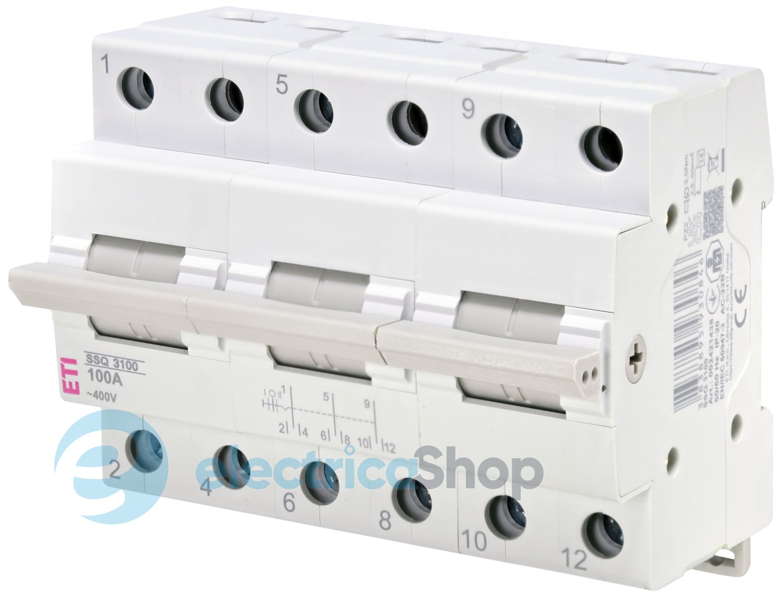 Перемикач SSQ 2421438 (це триполюсний перекидний рубильник) призначений для прямої комутації навантажень невеликої потужності (100A ) або комутації за допомогою додаткових контакторів або силових реле.
