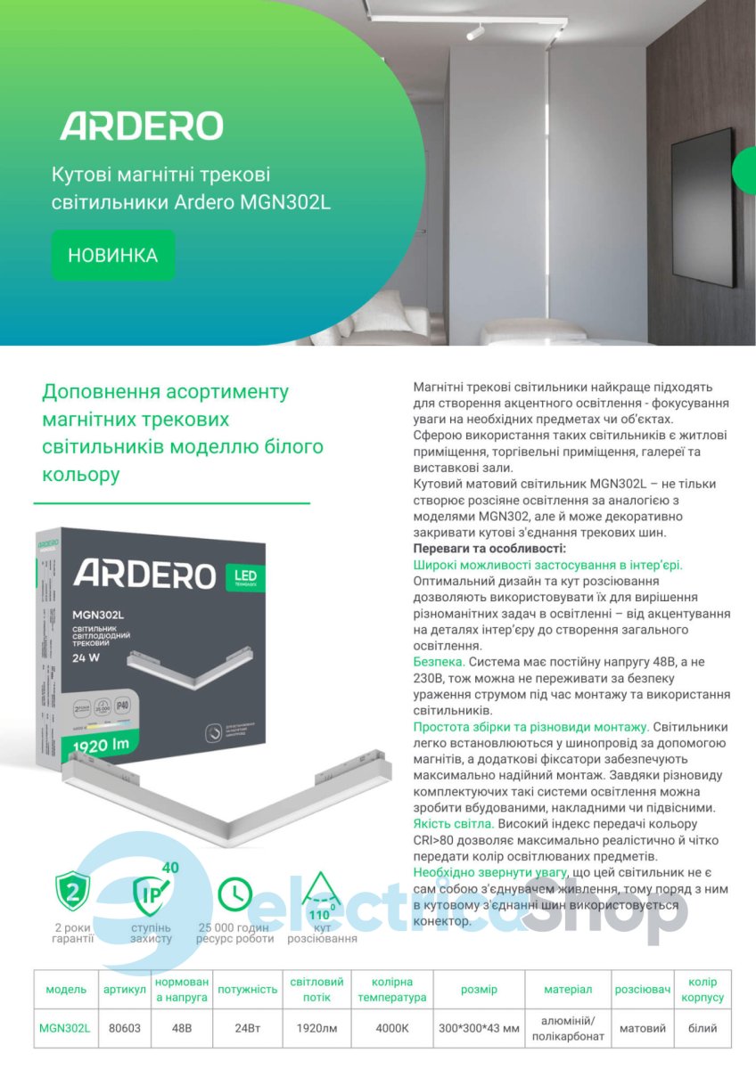 Кутовий магнітний трековий світильник Feron Ardero MGN302L 24W 4000K 80603 призначений для створення акцентного освітлення, створює фокус на необхідних предметах або об'єктах. Використовується в житлових і комерційних приміщеннях, галереях і торгових залах. Кут розсіювання 110° дозволяє використовувати модель для вирішення різних завдань в освітленні, створення світлових ліній в інтер'єрі. Світильники легко встановлюються за допомогою магнітів, фіксатори забезпечують максимально надійний монтаж у шинопроводі. Високий індекс кольору Ra>80 дозволяє максимально реалістично передати колір освітлюваних предметів.