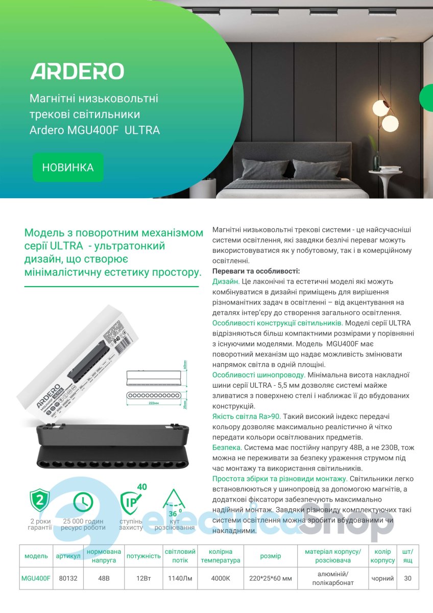 Магнітний трековий світильник Feron Ardero MGU400F ULTRA 12W 4000K 80132 призначений для створення акцентного освітлення, створює фокус на необхідних предметах або об'єктах та вирізняється компактним дизайном. Використовується в житлових і комерційних приміщеннях, галереях і торгових залах. Кут розсіювання 36° дозволяє використовувати модель для вирішення різних завдань в освітленні, створення світлових ліній в інтер'єрі. Світильники легко встановлюються за допомогою магнітів, фіксатори забезпечують максимально надійний монтаж у шинопроводі. Високий індекс кольору Ra>90 дозволяє максимально реалістично передати колір освітлюваних предметів.