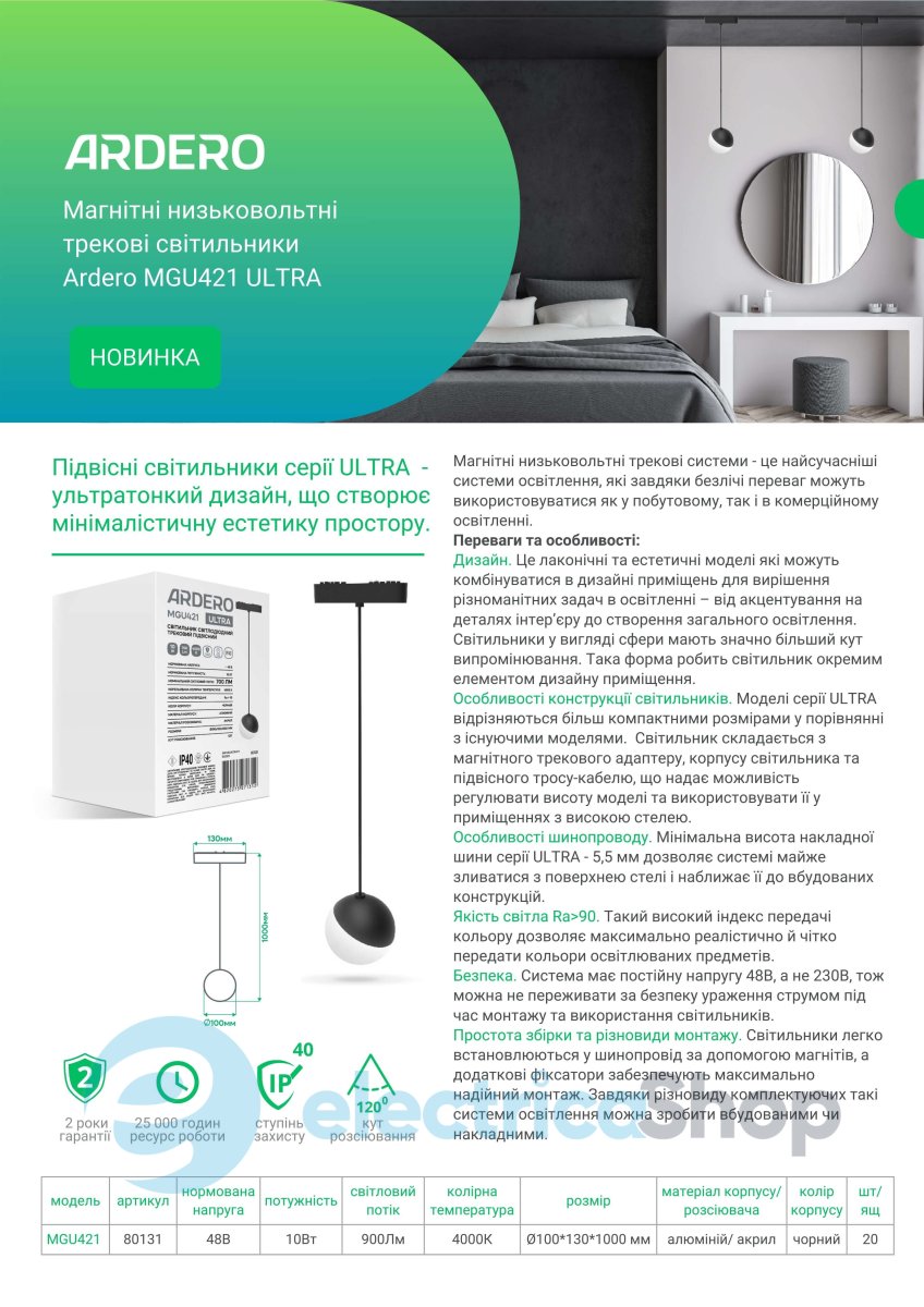 Магнітний трековий світильник Feron Ardero ULTRA MGU421 10W 4000K 80131 призначений для створення акцентного освітлення, створює фокус на необхідних предметах або об'єктах та вирізняється компактним дизайном. Використовується в житлових і комерційних приміщеннях, галереях і торгових залах. Кут розсіювання 120° дозволяє використовувати модель для вирішення різних завдань в освітленні, створення світлових ліній в інтер'єрі. Світильники легко встановлюються за допомогою магнітів, фіксатори забезпечують максимально надійний монтаж у шинопроводі. Високий індекс кольору Ra>90 дозволяє максимально реалістично передати колір освітлюваних предметів.