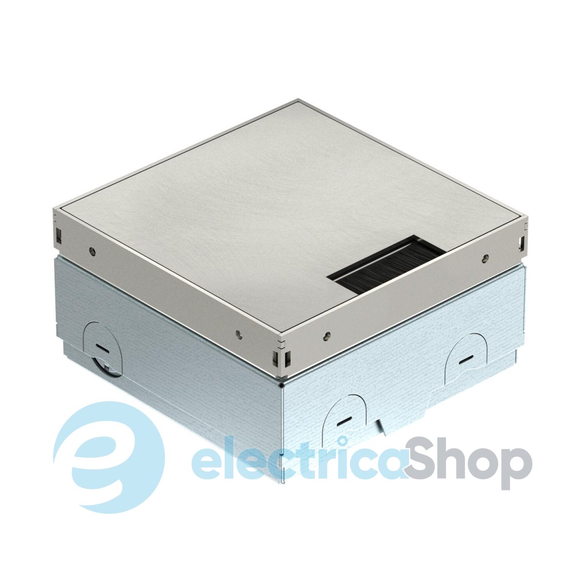 Квадратний підлоговий розетковий люк для використання в приміщеннях із сухою системою прибирання та стяжкових підлогах у внутрішніх приміщеннях. Монтажний корпус з попередньо штампованими вхідними отворами для труб (M20/M25). Кришка регулюється до верхнього краю підлогового покриття за допомогою 4 опор для регулювання висоти. Мінімальна глибина установки становить 75 mm, діапазон регулювання висоти — +30 mm. Рамка та кришка з нержавіючої сталі, видимі в підлоговому покритті. Кришка з декоративною пластиною та щітковим виведенням для прокладання кабелів. Навантажувальна здатність 15 kN гарантується лише у невикористаному стані. Порожній корпус для одного Modul 45® установочного пристрою та однієї гнізда даних. Поставляється закритим глухою пластиною.