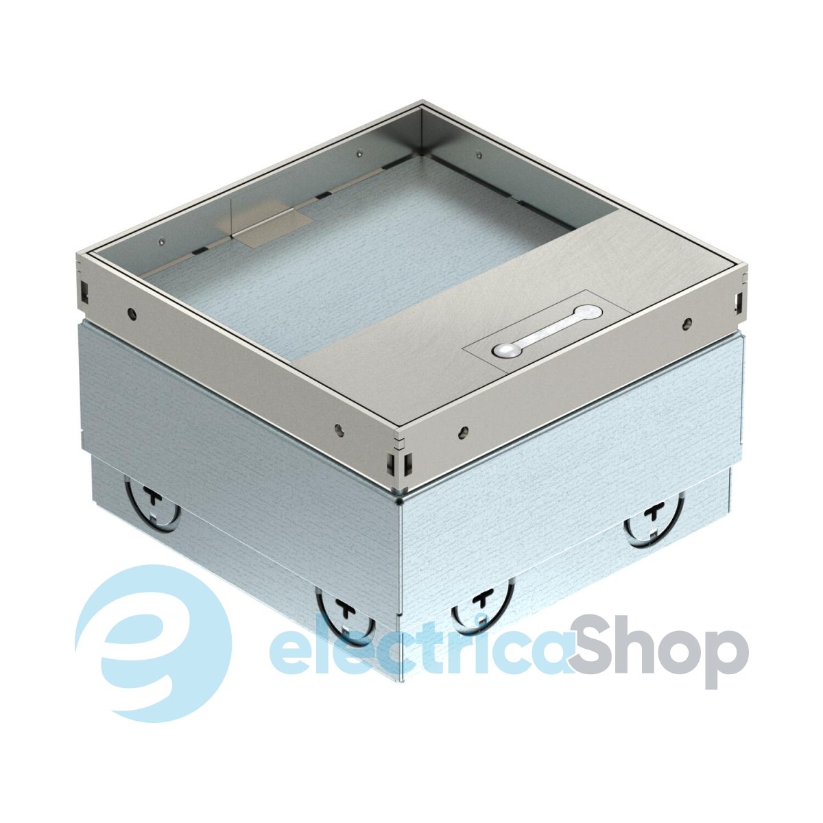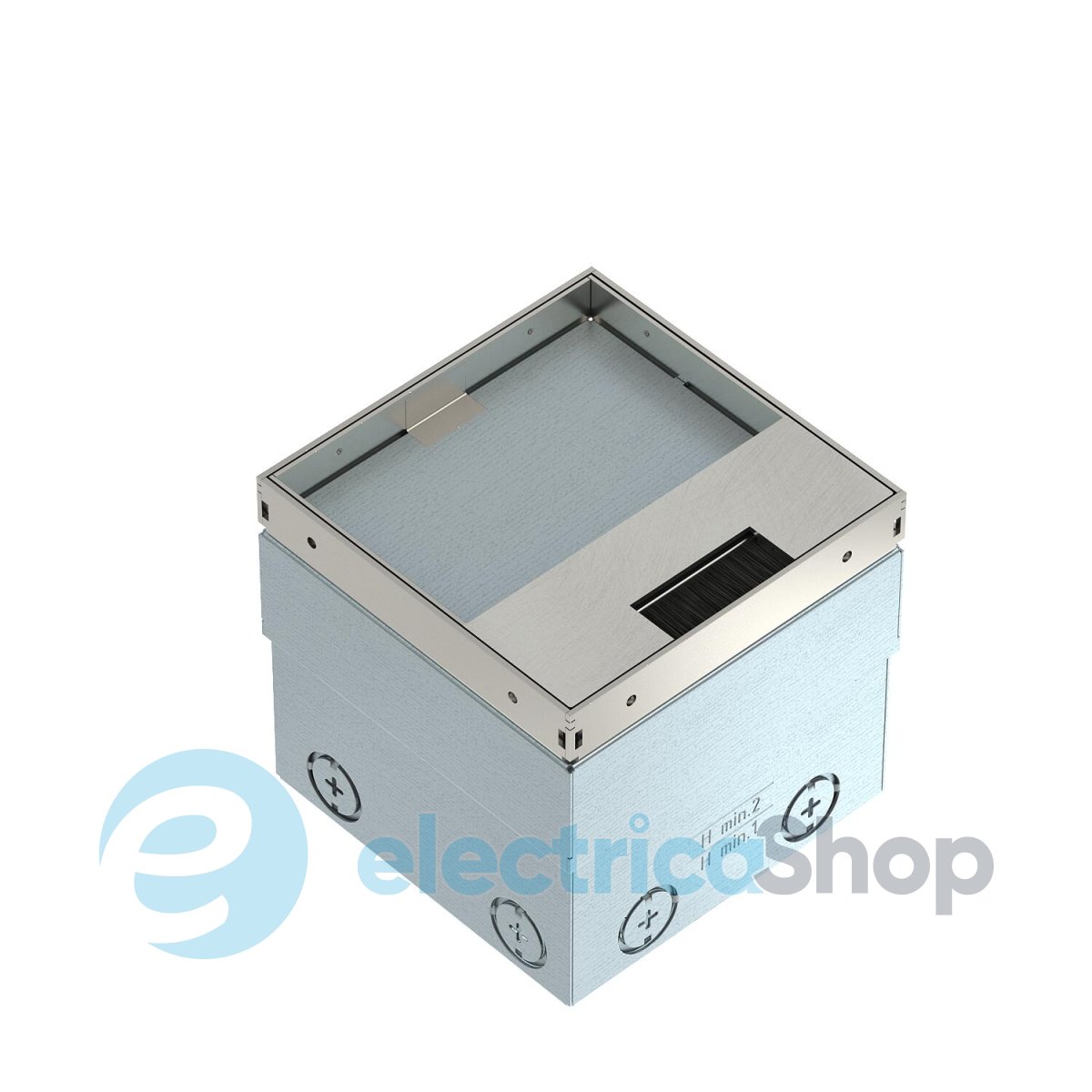 Квадратний підлоговий розетковий люк для використання в сухих порожнистих і стяжкових підлогах у внутрішніх приміщеннях. Монтажний корпус з попередньо штампованими вхідними отворами для труб (M20/M25). Кришка регулюється до верхнього краю підлогового покриття за допомогою чотирьох опор для регулювання висоти. Мінімальна глибина установки становить 110 mm, діапазон регулювання висоти — 25 mm. Рамка та кришка виготовлені з нержавіючої сталі та видимі в підлоговому покритті. Кришка з поглибленням для підлогового покриття та щітковою планкою для прокладання кабелів. Навантажувальна здатність 15 kN гарантується лише у невикористаному стані. Порожній корпус для до 2 пристроїв Modul 45® у монтажному супорті та 2 гнізд даних в опціональному супорті для технологій передачі даних.