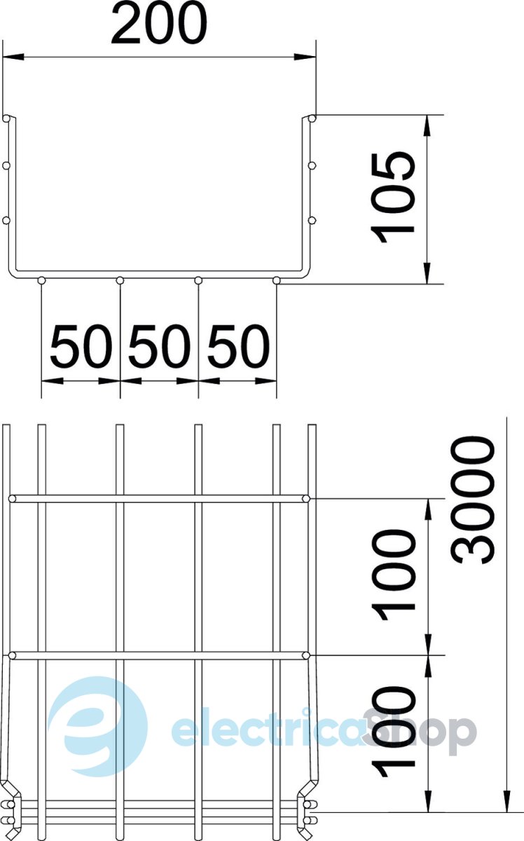 Дротяний лоток зі з'єднувачем у висоті стінки 105 мм. Затухання магнітного поля від впливу екрана без кришки 15 дБ, із кришкою – 25 дБ.