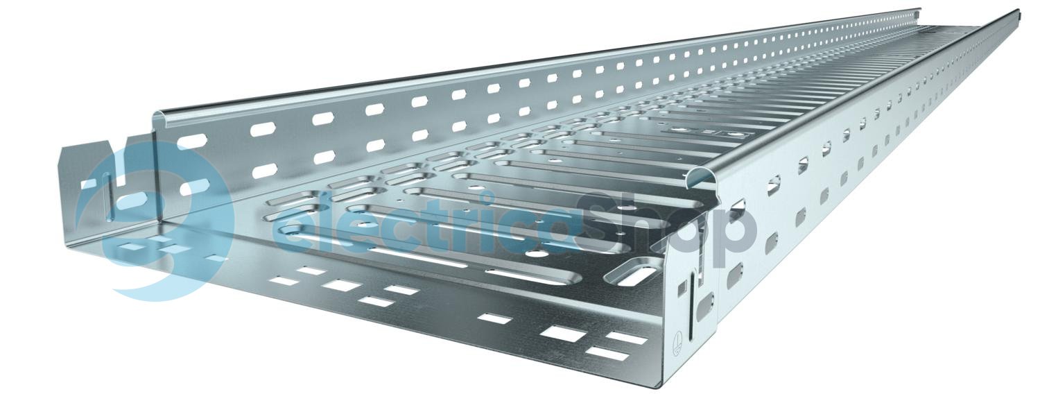 Лоток кабелю з інтегрованою системою швидкого монтажу. Корисна довжина кабельного лотка у зібраному стані становить 3000 мм. Кабельний лоток має суцільну бічну перфорацію 7 х 20 мм для встановлення додаткових сполучних та монтажних елементів. Перфорація для прямого підвісу стрижня з різьбленням має діаметр 11 мм. Магнітне згасання від впливу екрана: без кришки 20 дБ, кришкою 50 дБ.