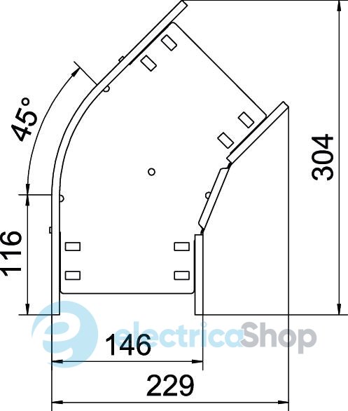 Кутова секція 45° для створення горизонтального відгалуження, фасонна деталь для кабельних лотків, що замикаються і пригвинчуються, висота бічної стінки 60 мм. Безгвинтовий монтаж за допомогою подвійних затискачів або різьбове з'єднання за допомогою гвинтів із низькою напівкруглою головкою FRS і комбінованих гайок M6. Можна встановлювати як усередині приміщення, так і зовні. Кріпильний матеріал замовляється окремо.