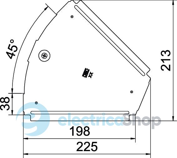 Кришка для фасонної деталі 45° для кабельних лотків, що використовуються всередині приміщень, для захисту кабелів від пошкоджень і бруду. Кріплення за допомогою попередньо змонтованої засувки та опорного елемента кришки ділянки. Підходить для будь-якої висоти бічної стінки.