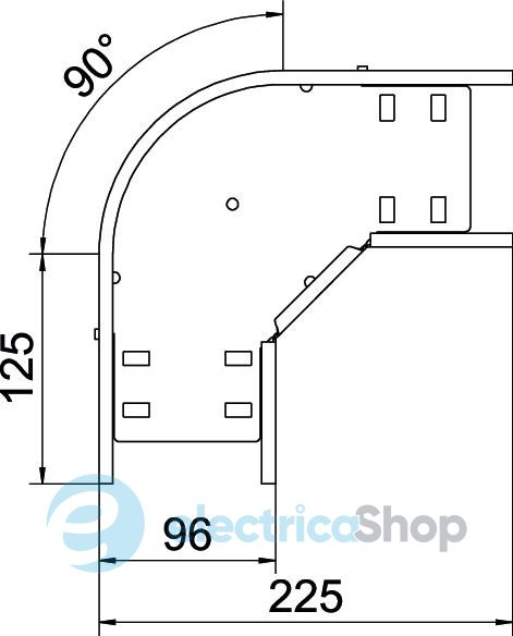 Кутова секція 90° для створення горизонтального відгалуження, фасонна деталь для кабельних лотків, що замикаються і пригвинчуються, висота бічної стінки 60 мм. Безгвинтовий монтаж за допомогою подвійних затискачів або різьбове з'єднання за допомогою гвинтів із низькою напівкруглою головкою FRS і комбінованих гайок M6. Можна встановлювати як усередині приміщення, так і зовні. Кріпильний матеріал замовляється окремо.