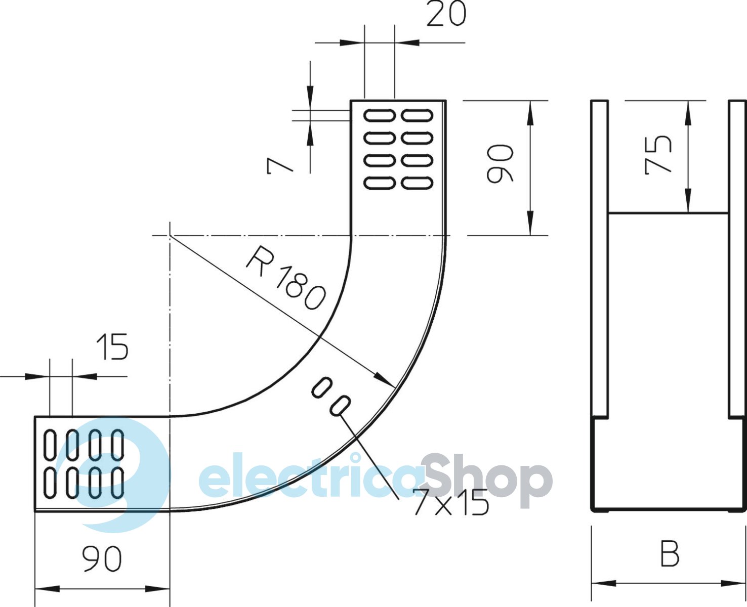 Вихідна вертикальна кутова секція 90° для всіх типів кабельних лотків з висотою бічної стінки 60 мм.