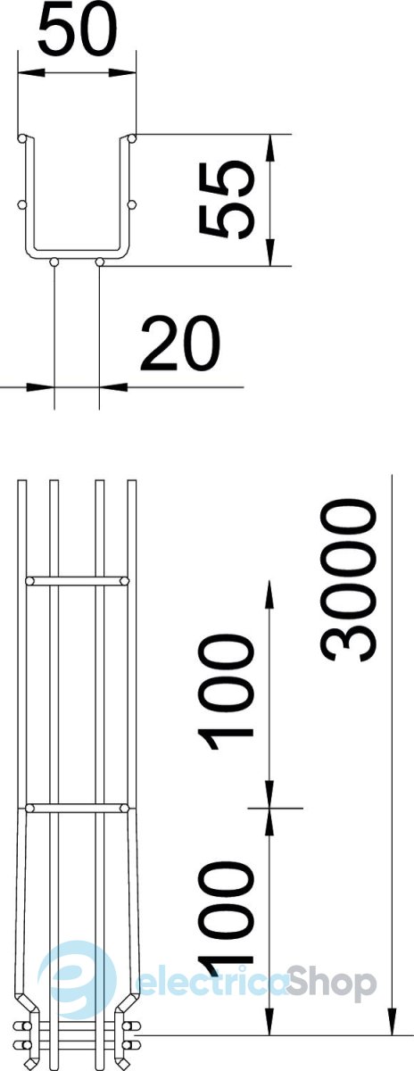 Дротяний лоток зі з'єднувачем відповідної форми зі сторонами вистій 55 мм. Магнітне згасання від впливу екрана: без кришки 15 дБ, кришкою 25 дБ.