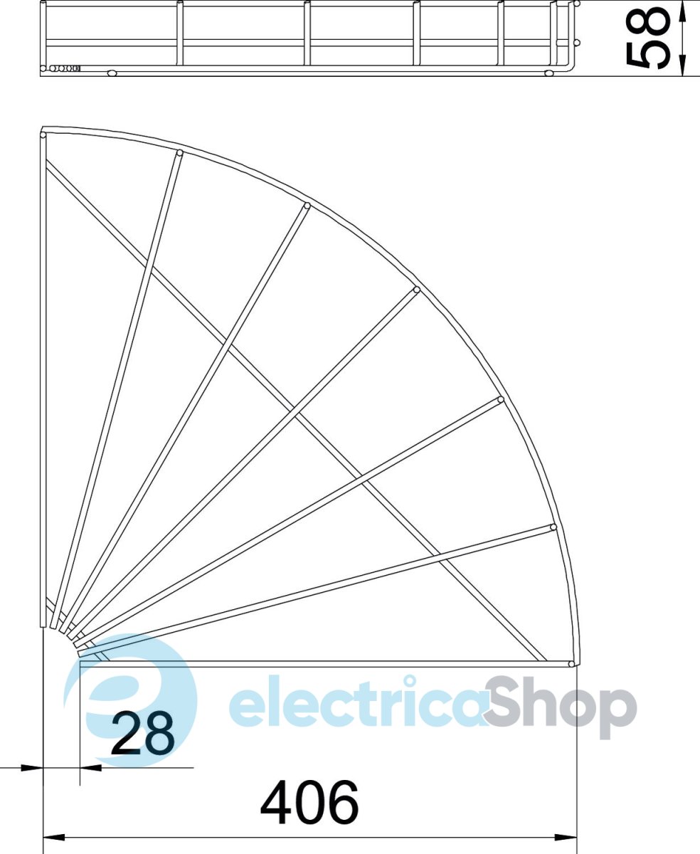 Горизонтальна кутова секція 90° для дротяних лотків, висота бічної стінки яких становить 55 мм.