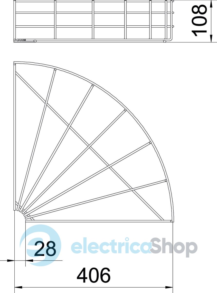 Горизонтальна кутова секція 90° для дротяних лотків, висота бічної стінки яких становить 105 мм.