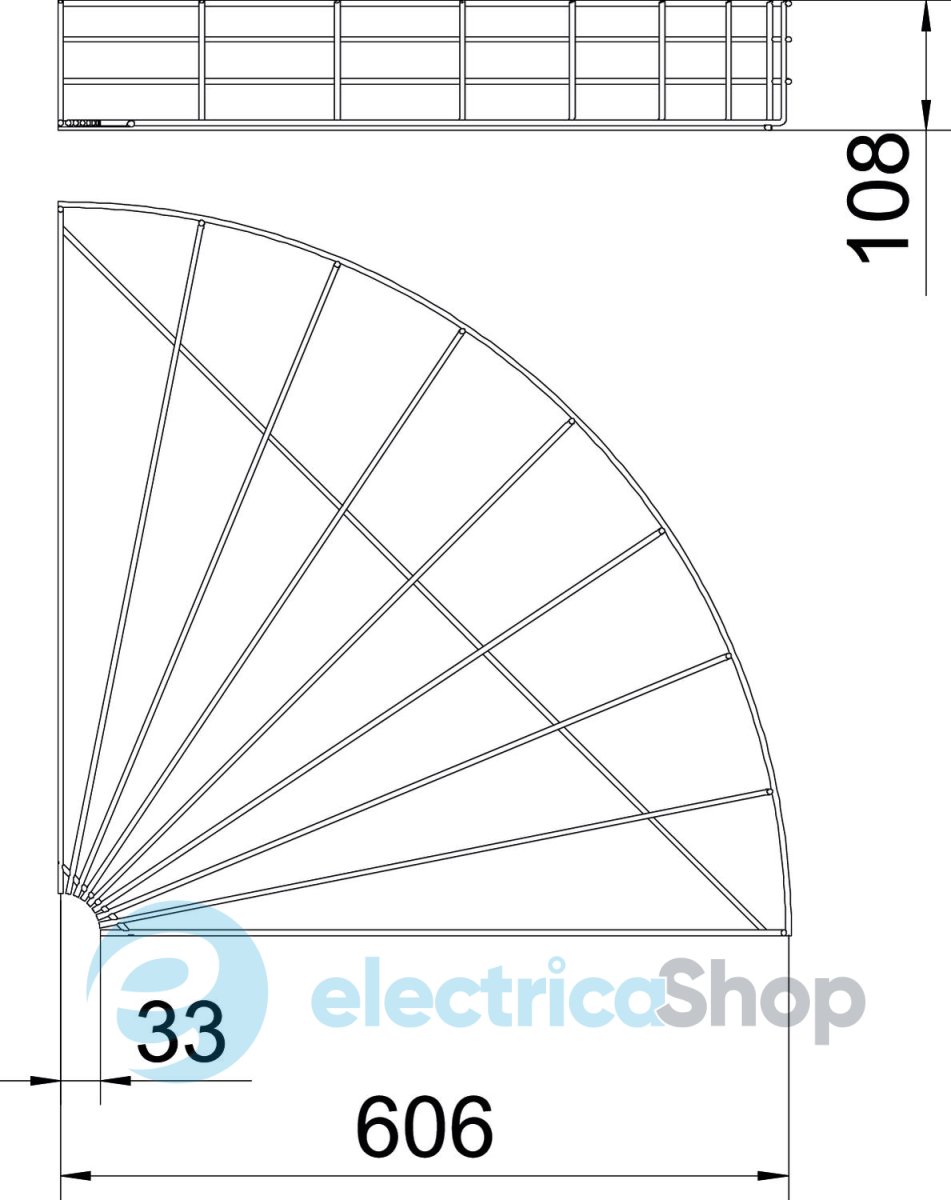 Горизонтальна кутова секція 90° для дротяних лотків, висота бічної стінки яких становить 105 мм.