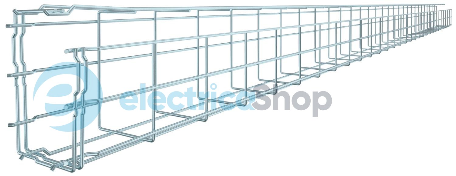 G-подібний дротяний лоток із сталевого дроту, з'єднаного методом точкового зварювання, з різною висотою бічної стінки та шириною. Для прямого настінного та стельового монтажу. Дані навантаження при різних способах монтажу надаються за запитом. Магнітне згасання від впливу екрана 15 дБ.