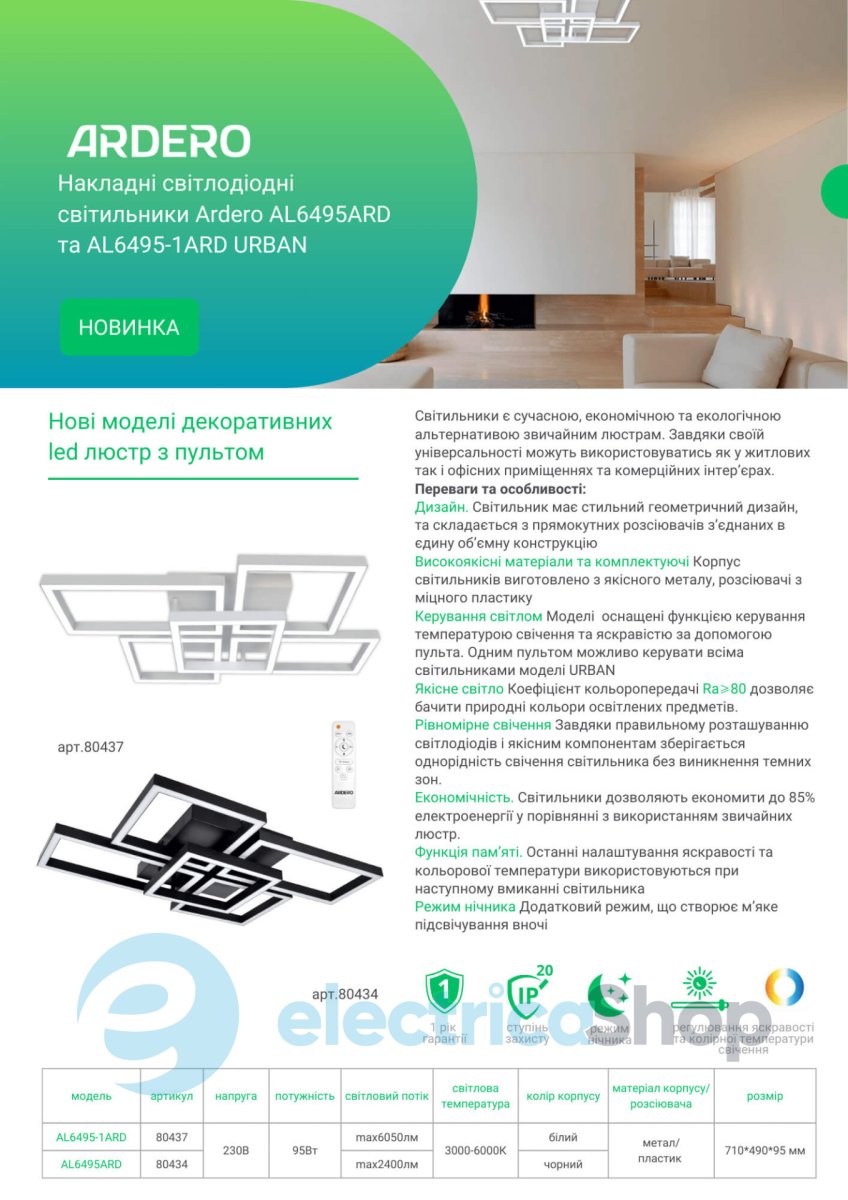 Світильник Ardero URBAN W 95W AL6495-1ARD 80437 має мінімалістичний дизайн та підходить для розміщення в житлових та комерційних приміщеннях, добре поєднується із сучасними мотивами в інтер'єрі.