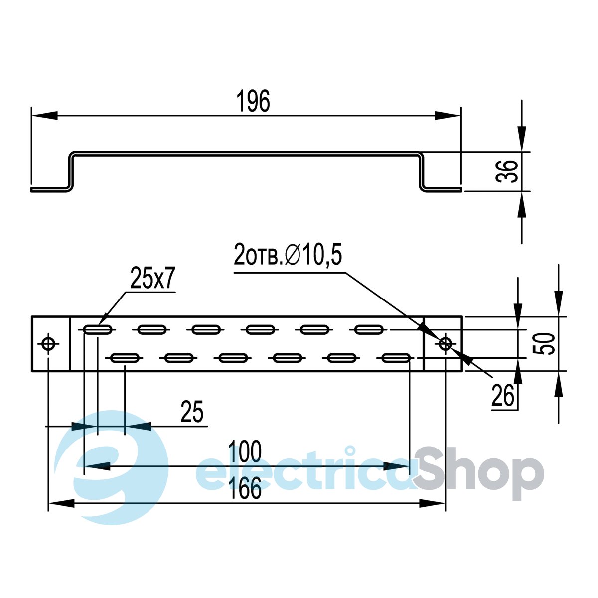 Кріплення призначене для фіксації до стіни при вертикальному або підлоговому монтажі лотків та для організації підвісу на шпильках. Скоба розрахована на лоток шириною до 100 мм.