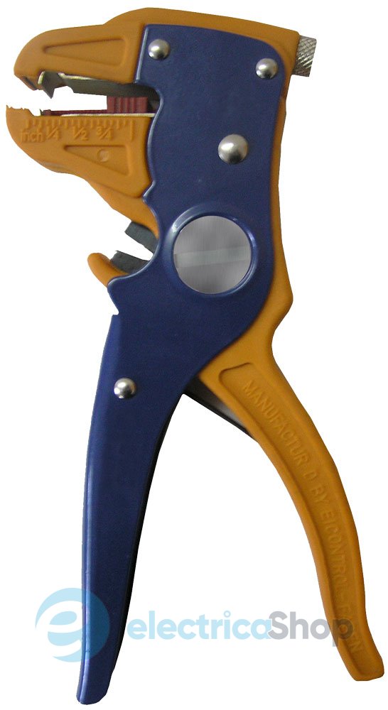 Інструмент e.tool.strip.700.d.0,2.4 для зняття ізоляції проводів перетином 0,2-4 кв.мм. Довжина ізоляції, що знімається з проводу, регулюється дюймовою лінійкою. Діаметр провідника регулюється юстирувальним гвинтом. Інструмент має кусачки для різання жил провідників.
