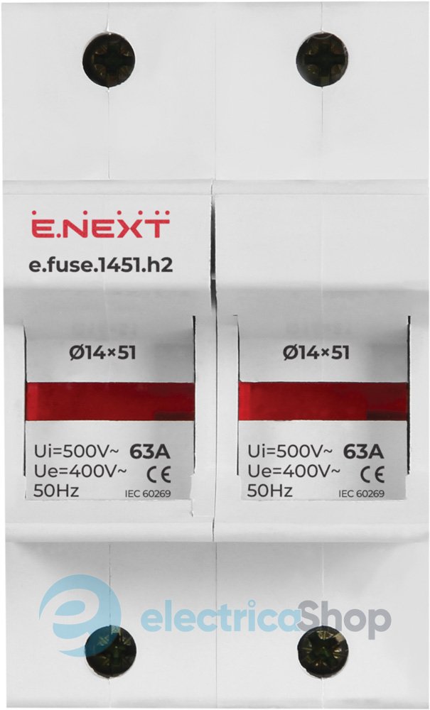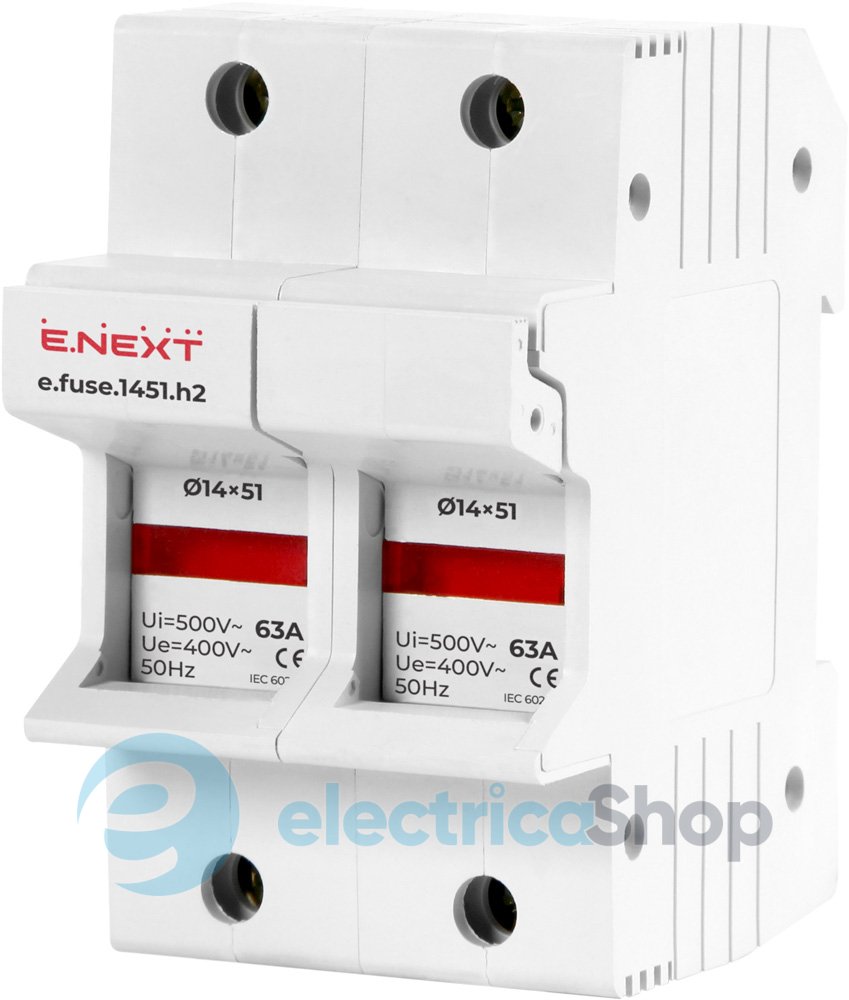 Утримувач запобіжника на Дін-рейку e.fuse.1451.h2, під запобіжник 14х51, 2р, 63А призначені для встановлення запобіжників серії e.fuse.1451 на струми від 25 до 63 А.
