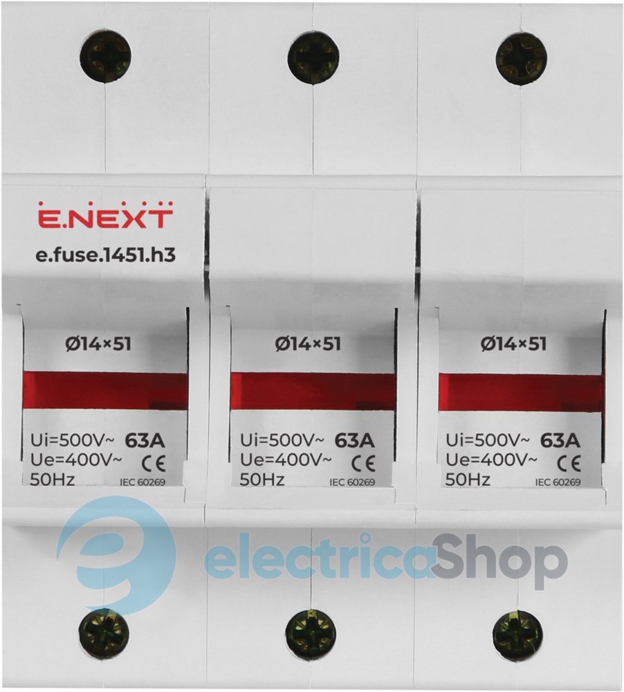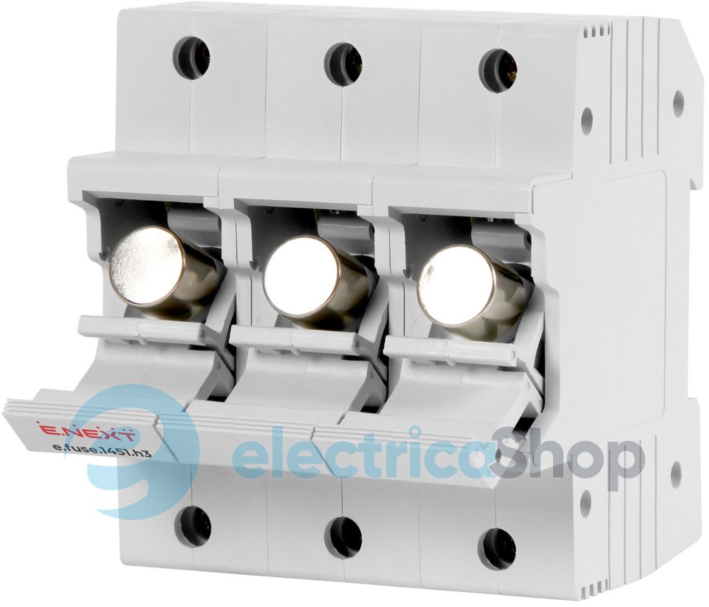 Утримувач запобіжника на Дін-рейку e.fuse.1451.h3, під запобіжник 14х51, 3р, 63А призначені для встановлення запобіжників серії e.fuse.1451 на струми від 25 до 63 А.