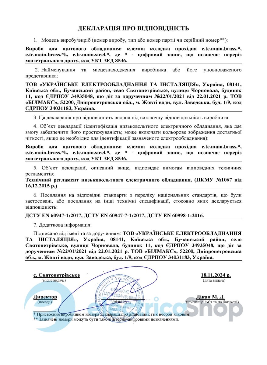 - Відповідність стандартам: ДСТУ EN 60947-1, ДСТУ EN 60947-7-1