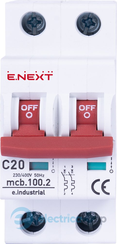 Модульний автоматичний вимикач e.industrial.mcb.100.2.C20, 2 р, 20А, C, 10кА призначений для захисту низьковольтних електричних мереж та обладнання від струмів перевантаження та короткого замикання, а також нечастих оперативних комутацій електричних мереж.<br /><br />Виріб відповідає Технічним регламентам безпеки низьковольтного електричного обладнання та електромагнітної сумісності обладнання ДСТУ IEC 60947-1:2008, ДСТУ IEC 60947-2:2008, ДСТУ IEC 60898-1:2005