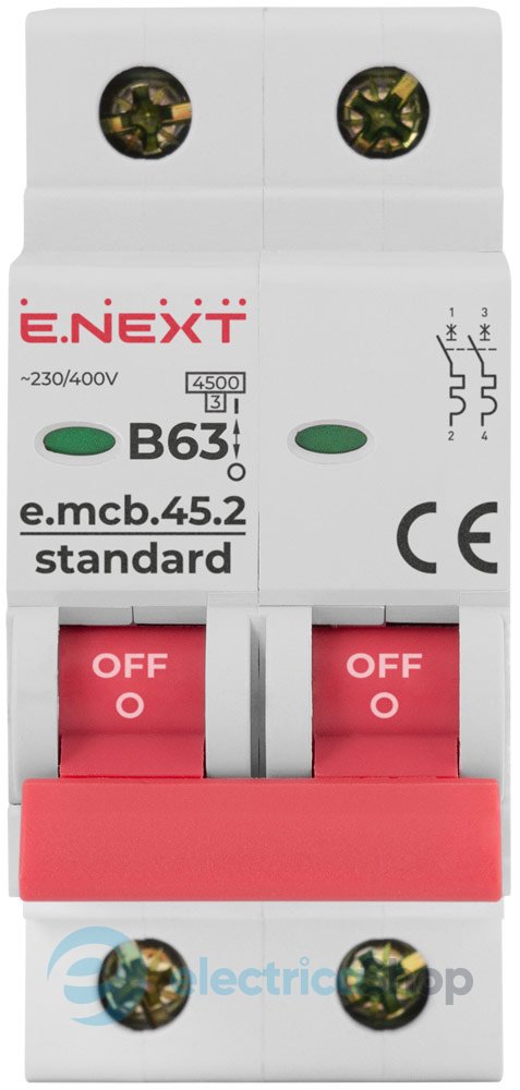 Модульний автоматичний вимикач e.mcb.stand.45.2.B63, 2р, 63А, В, 4,5 кА призначені для захисту електричних мереж та обладнання низької напруги від струмів перевантаження та короткого замикання, а також нечастих оперативних комутації електричних мереж.