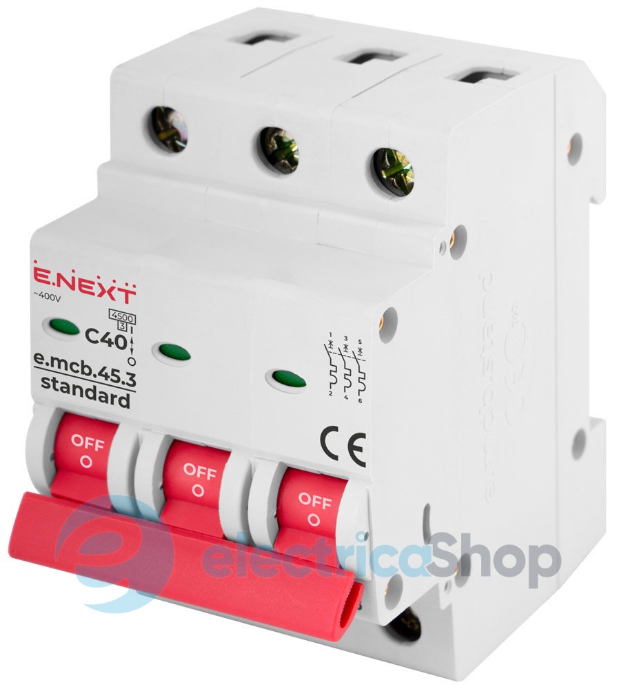 Модульний автоматичний вимикач e.mcb.stand.45.3.C40, 3р, 40А, C, 4,5 кА призначені для захисту електричних мереж та обладнання низької напруги від струмів перевантаження та короткого замикання, а також нечастих оперативних комутації електричних мереж.