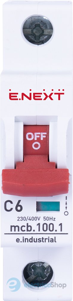 Модульний автоматичний вимикач e.industrial.mcb.100.1.C6, 1 р, 6А, C, 10кА призначений для захисту низьковольтних електричних мереж та обладнання від струмів перевантаження та короткого замикання, а також нечастих оперативних комутацій електричних мереж.<br /><br />Виріб відповідає Технічним регламентам безпеки низьковольтного електричного обладнання та електромагнітної сумісності обладнання ДСТУ IEC 60947-1:2008, ДСТУ IEC 60947-2:2008, ДСТУ IEC 60898-1:2005