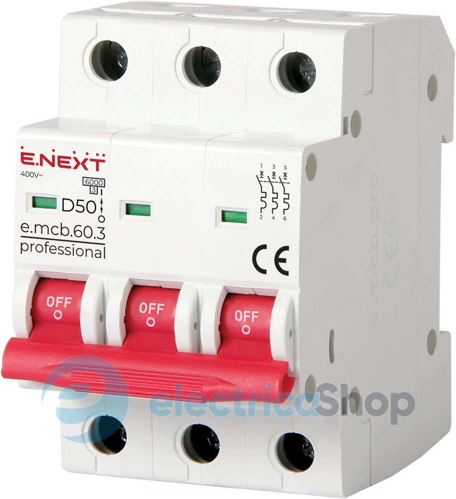 Модульний автоматичний вимикач e.mcb.pro.60.3.D.50 , 3р, 50А, D, 6кА призначені для захисту електричних мереж та обладнання низької напруги від струмів перевантаження та короткого замикання, а також нечастих (до 30 разів на добу) оперативних комутацій електричних мереж.
