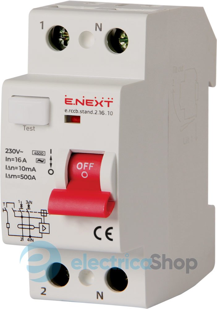 Вимикач диференційного струму e.rccb.stand.2.16.10 2р, 16А, 10mA Пристрої захисту відключення призначені для відключення ділянки мережі при досягненні струму витоку на землю заданої величини. ПЗВ застосовуються для захисту людей від ураження електричним струмом при контакті з струмопровідними частинами, а також для захисту обладнання від пожеж внаслідок порушення ізоляції проводки.