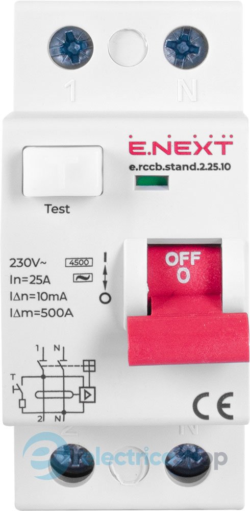 Вимикач диференційного струму e.rccb.stand.2.25.10 2р, 25А, 10mA Пристрої захисту відключення призначені для відключення ділянки мережі при досягненні струму витоку на землю заданої величини. ПЗВ застосовуються для захисту людей від ураження електричним струмом при контакті з струмопровідними частинами, а також для захисту обладнання від пожеж внаслідок порушення ізоляції проводки.