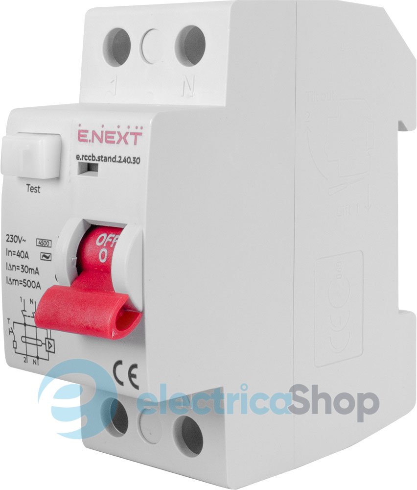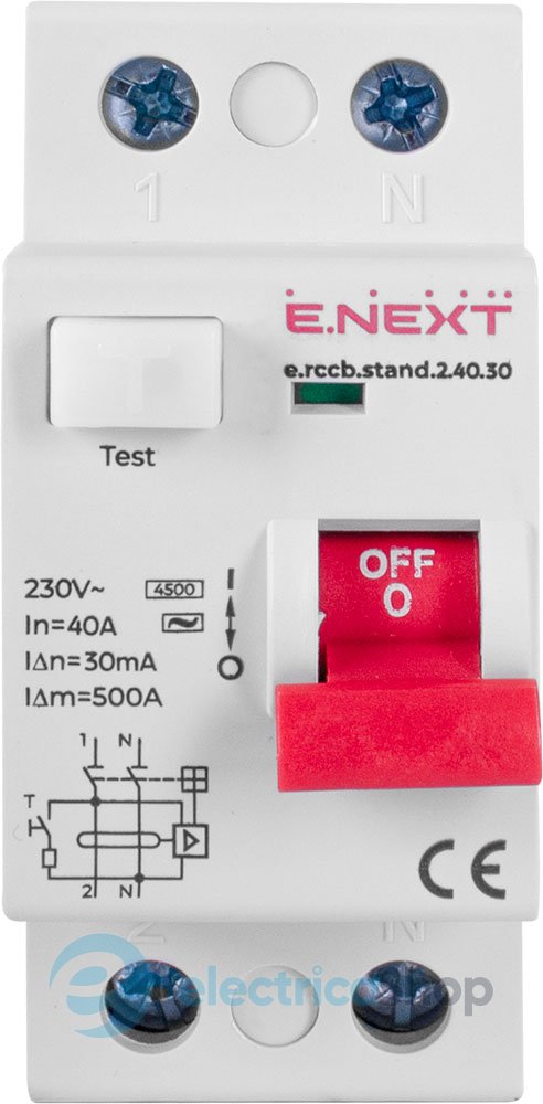 Вимикач диференційного струму e.rccb.stand.2.40.30 2р, 40А, 30mA Пристрої захисту відключення призначені для відключення ділянки мережі при досягненні струму витоку на землю заданої величини. ПЗВ застосовуються для захисту людей від ураження електричним струмом при контакті з струмопровідними частинами, а також для захисту обладнання від пожеж внаслідок порушення ізоляції проводки.