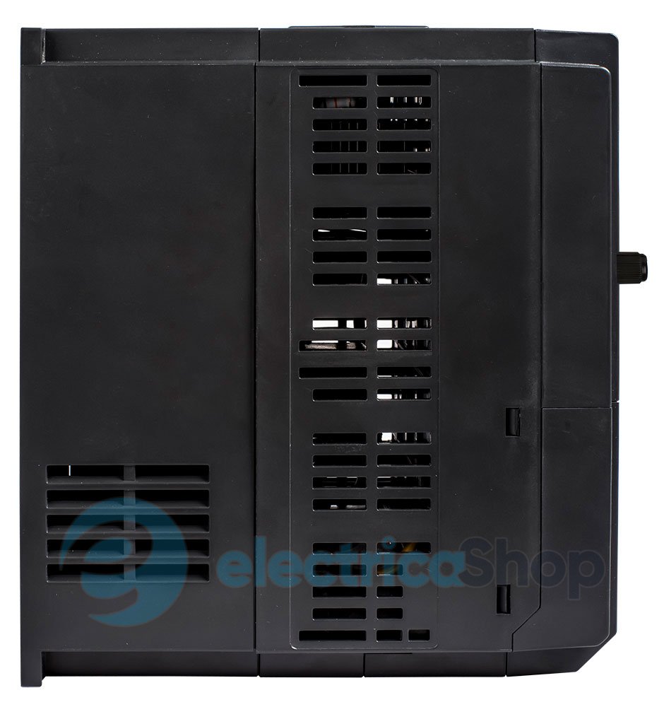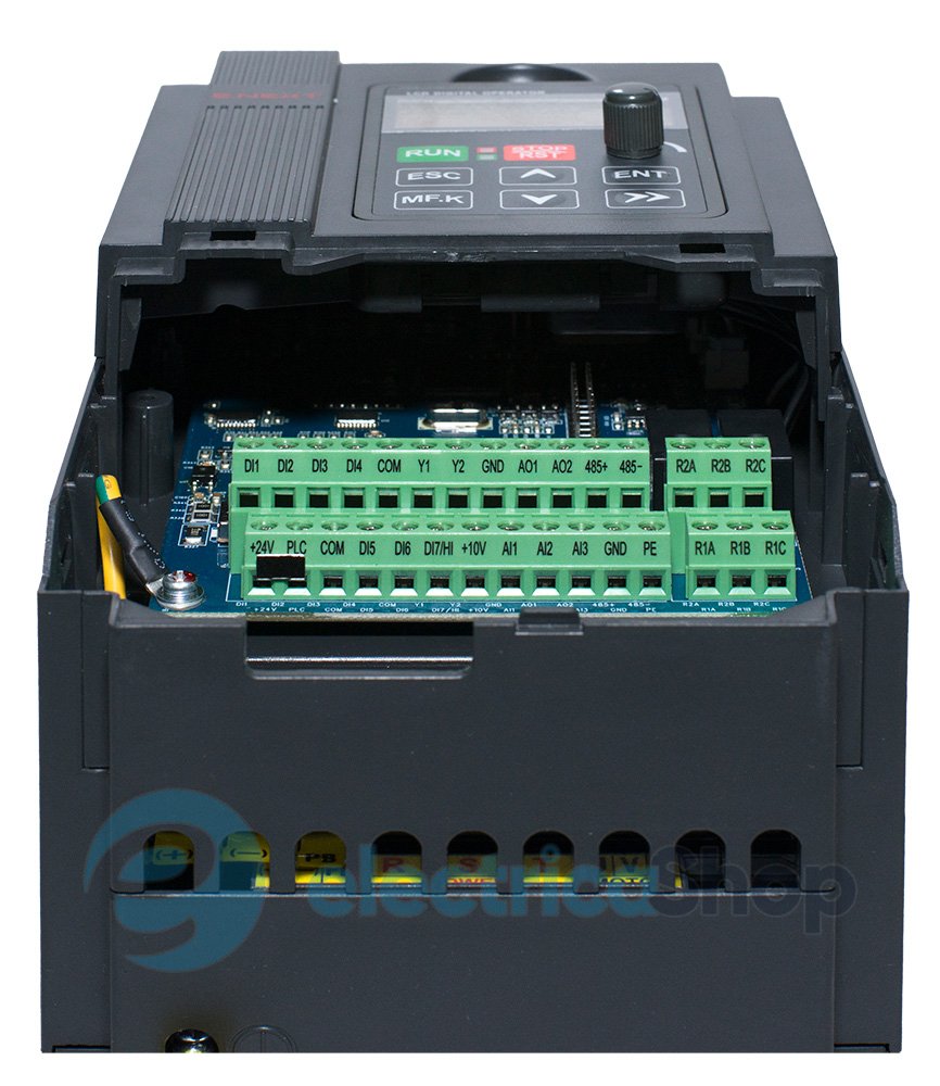 - Входи / виходи сигналів управління: 7 програмованих цифрових клем серед яких 1 високошвидкісна імпульсна клема (до 100кГц), 3 програмованих аналогових входи 0…+10В або 0…20мА, 2 цифрових програмованих вихіди з відкритим колектором серед яких 1 високочастотний імпульсний вихід (100кГц), 2 релейних програмованих виходи, 2 програмованих аналогових виходи 0…+10В або 0…20мА, RS485 (Modbus RTU)