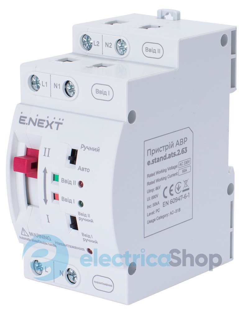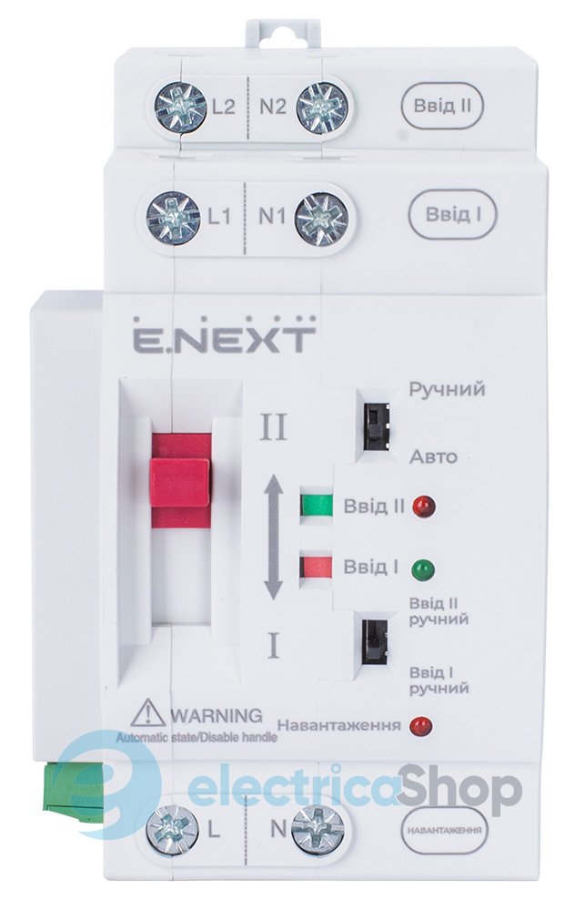 Пристрій АВР E.Next призначений для автоматичного перемикання на резервне живлення електричних 1-фазних ланцюгів змінного струму напругою до 240 В та частотою 50 Гц.