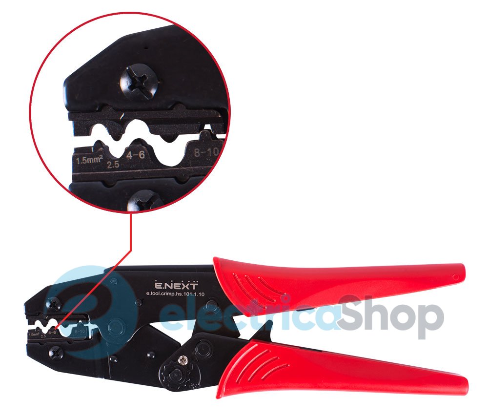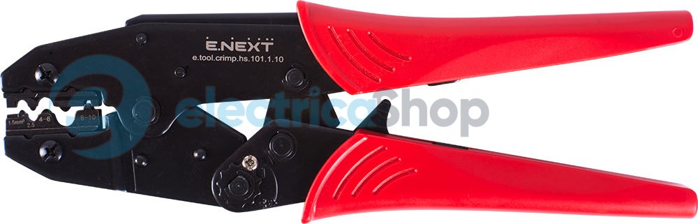 Інструмент e.tool.crimp.hs.101.1.10 для обтиску неізольованих наконечників 1,0-10,0 кв.мм призначений для обтискання ізольованих кабельних наконечників. Використовується для опресування ізольованих гільз, кільцевих, втулкових та вилкових наконечників. Обтискний має важільну передачу з храповим механізмом і системою розблокування, що регулюється, що виключає можливість недоопресування.