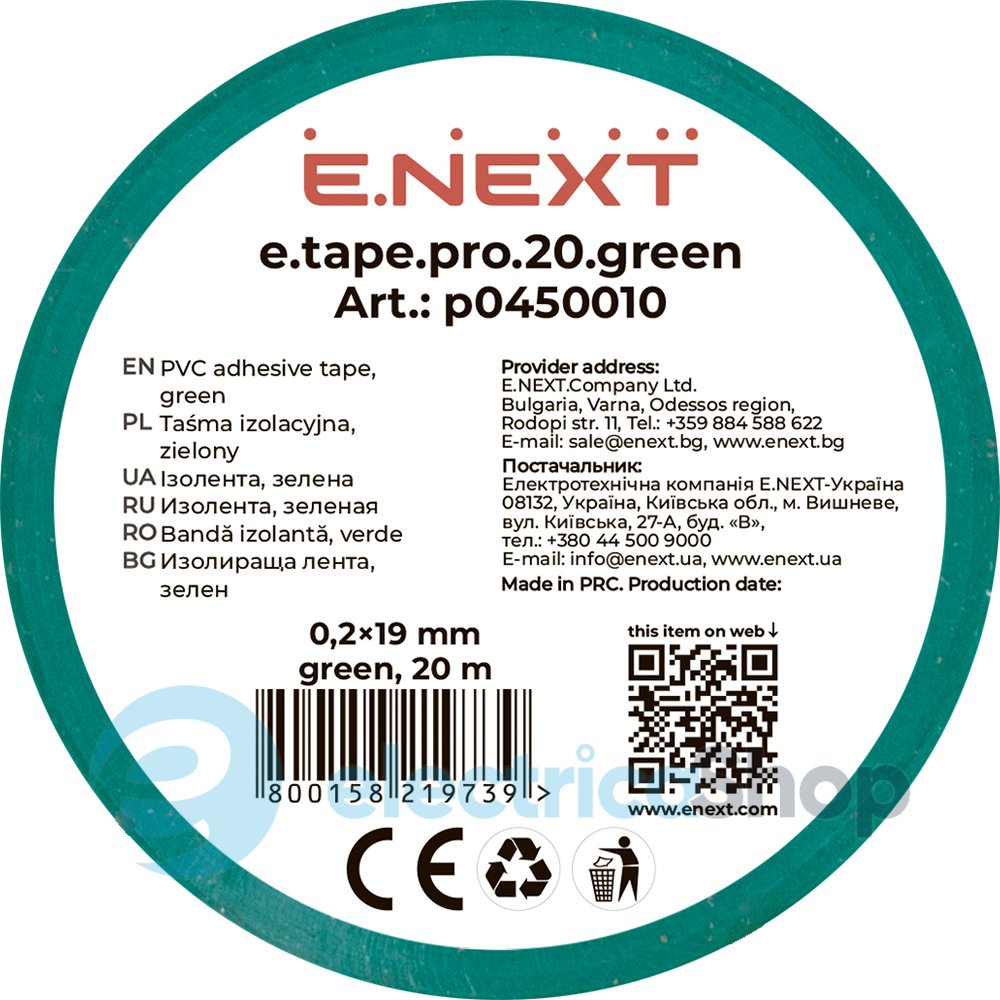 Ізоляційна стрічка e.tape.pro.10.green із самозгасаючого ПВХ, зелена (10м) p0450003 E.NEXT