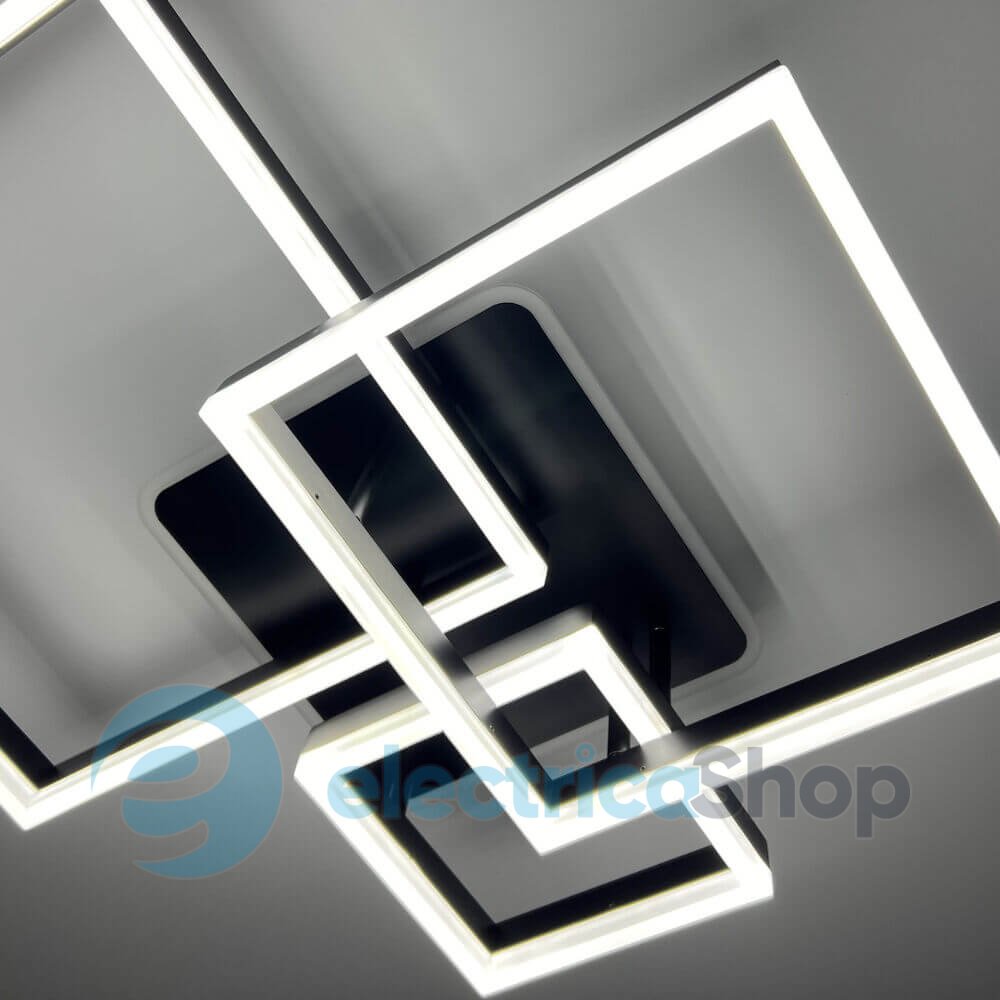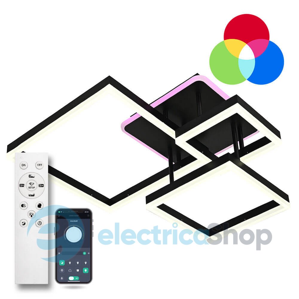 Світильник стельовий Luminaria GENNY SQUARE RGB 105W 4S BLACK з пультом ДК виготовлений з алюмінію, в якості розсіювача використовується білий матовий силікон. Площа освітлення до 25м². Світильник має функцію регулювання яскравості та вибору колірної температури, у комплекті пульт дистанційного керування. Можна керувати світильником за допомогою мобільного додатка (LampSmart Pro). Також основні режими можуть перемикатися без пульта за допомогою настінного вимикача; є функція нічника та пам'ять останнього вибраного режиму. Це економічна та багатофункціональна модель освітлення LUMINARIA.