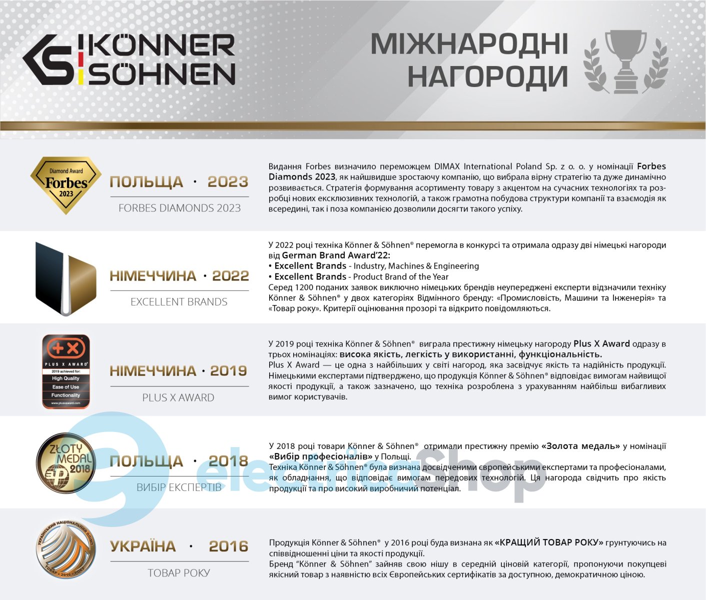 - ГЕНЕРАТОР 2 В 1 - 230В / 400В: Генератор KS 16-1/3E оснащений унікальною інноваційною системою перемикання фаз VTS (Voltage Transfer Switch), яка дозволяє використовувати один генератор для однофазних (230В) та трифазних (400В) споживачів електроенергії практично без втрати потужності. Немає необхідності купувати два окремих генератори.