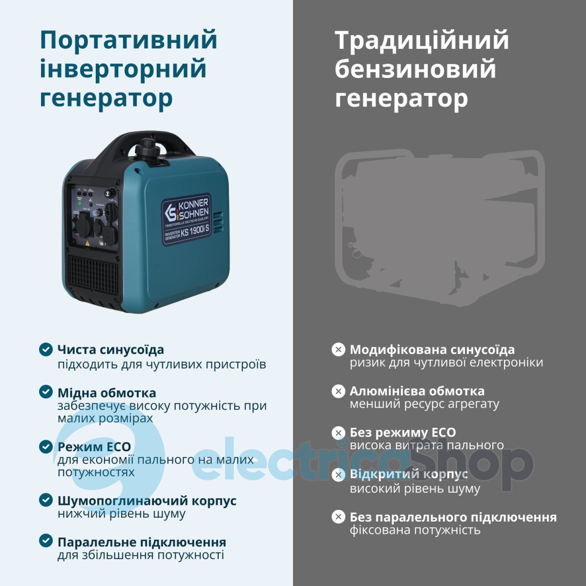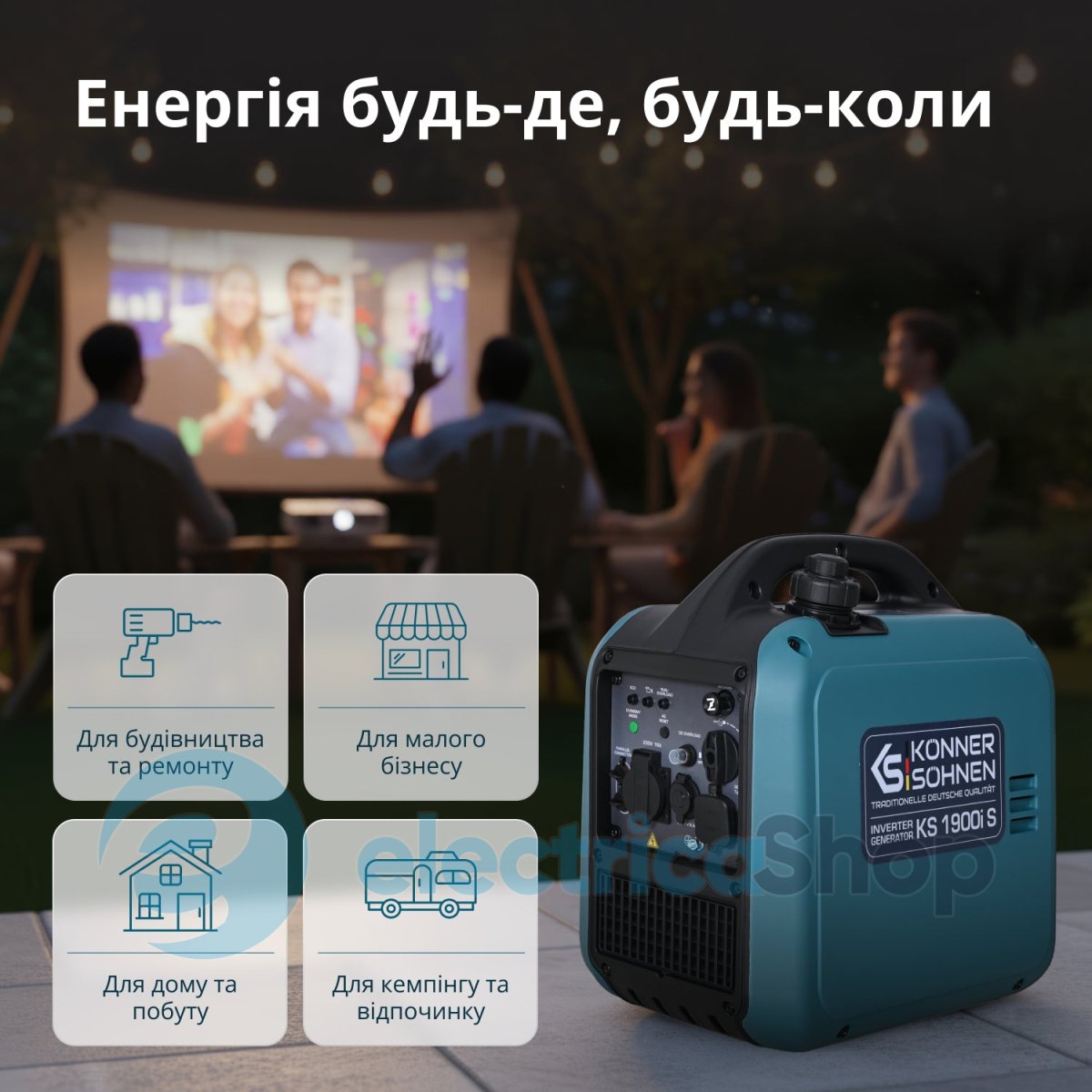 Інверторний генератор KS 1900i S (2,0 кВт) від Könner & Söhnen забезпечує стабільне живлення та безпечний роботу чутливої електроніки, такої як медичне обладнання, комп'ютери та високоточні прилади. Компактний і тихий, має шумопоглинаючий корпус, економічний режим, ідеально підходить для житлових зон, кемпінгу та подорожей. Підтримує паралельне підключення для збільшення потужності. Двигун відповідає стандарту EURO 5. Безщітковий альтернатор із 100% мідною обмоткою гарантує надійну роботу навіть під навантаженням. Стильний дизайн і мобільність роблять модель зручним джерелом резервної енергії.