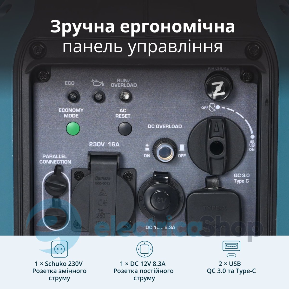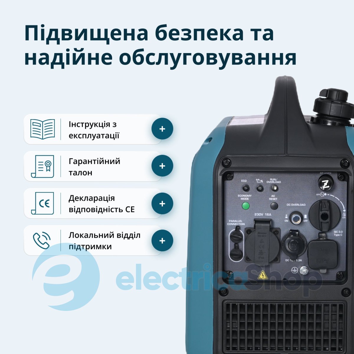 - Паралельне підключення: Можливість паралельного підключення двох генераторів через спеціальний прилад для отримання подвійної потужності.